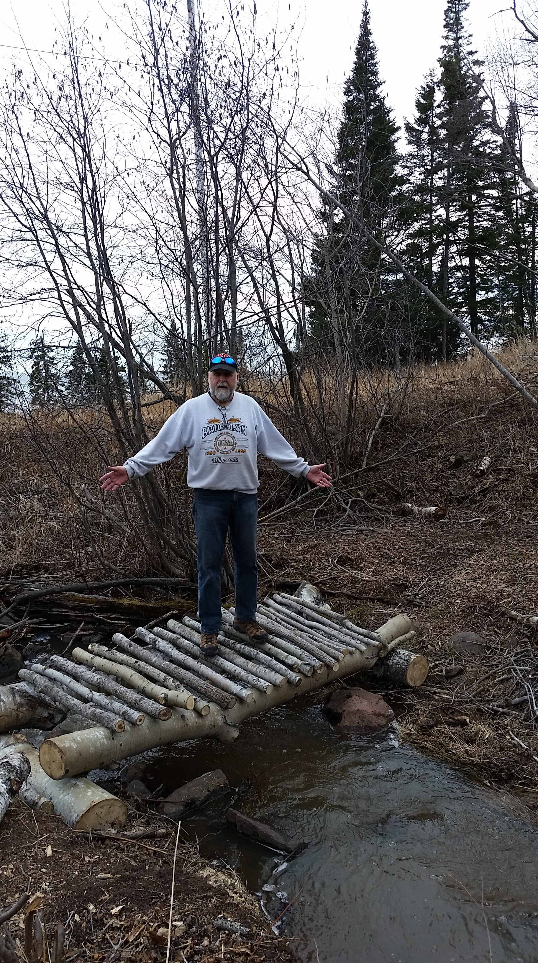 But anyway, back to the story. Why did I need to build a bridge across the creek? To get to the other side, of course! As you’ll see in the photos, some of the logs were quite large and required a great deal of effort to move. In true Paul fashion I had to do it all completely by myself. The only tools I used were a pry bar, relying on the ancient inventions of the wheel and the lever to get the logs in position, a hand saw to cut the bridge deck pieces, and a hammer and nails to hold everything together. (I also downed a fair number of Ibuprofen tablets to deal with the resulting aches and pains and put on a few Band-Aids to cover various cuts.)