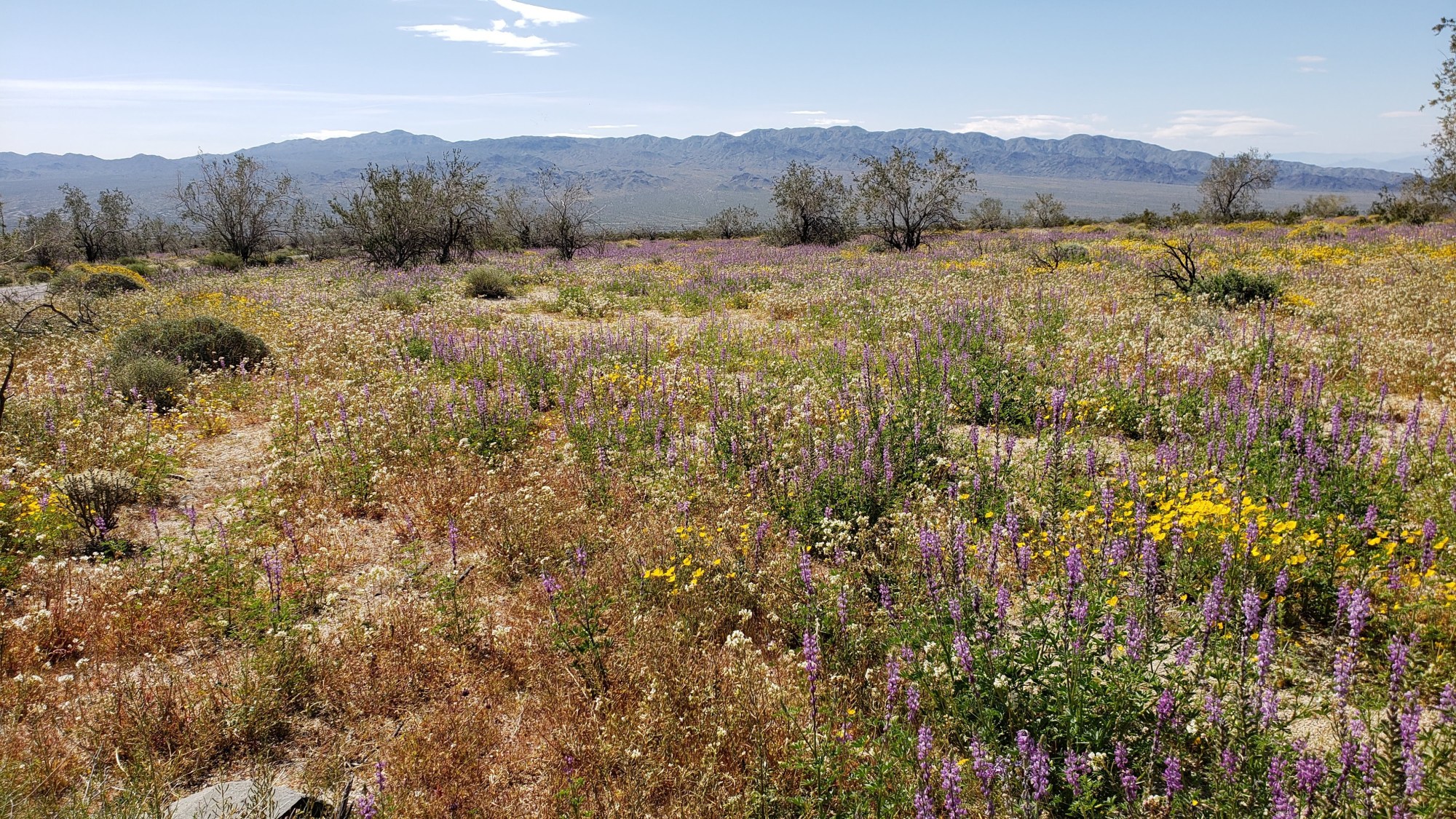 March 3-5 (Sunday-Tuesday): On Sunday we drove to Joshua Tree National Park. We had previously stayed at the Black Rock campground on the north side of the Park back in December; this time we entered from the south and stayed at the Cottonwood campground. As we drove into the Park, we were greeted by a stunning display of spring wildflowers in vibrant colors, primarily green, yellow, and purple.