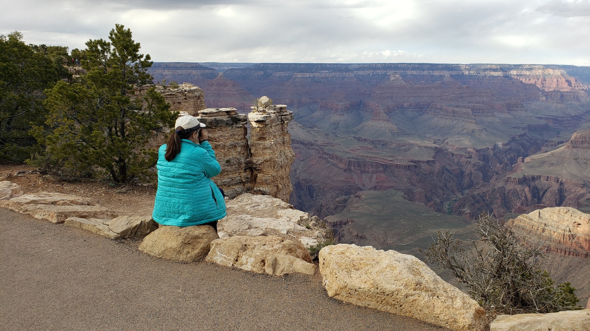 April 1-2 (Monday-Tuesday): On Monday, we departed from Lake Mead and headed for Tusayan, AZ. This was roughly a four-hour drive, which is the most we like to do in one day. At Tusayan, we stayed for two nights at the Grand Canyon Camper Village in a site with electric and water hookups. After settling in and getting oriented on Monday evening, we boarded the Tusayan shuttle on Tuesday morning and headed for the granddaddy of Gorgeous Gorges, the Grand Canyon itself. We last visited the Grand Canyon in 2005 with our sons, Nick and Brian. Since then, the NPS has instituted a shuttle system much like the Zion system. (Or, if it did exist back then, we weren’t aware of it.) There is a line with about five stops in the town of Tusayan that runs into the Park, bypassing the long line of vehicles waiting at the entrance gate, with a drop off at the main Visitor Center. Within the park, there are three lines that run along the south rim road and through the Grand Canyon Village, with multiple stops at excellent viewing locations. Once we arrived at the Visitor Center, we took the Orange Line to Yaki Point, the easternmost location served by the shuttles. After some walking and gawking, we rode back to the Visitor Center, rode a Blue Line shuttle through the village, then took a Green Line shuttle to Hermits Rest, the westernmost shuttle stop. The total distance from Yaki Point to Hermits Rest, if one were to walk along the rim trail, is thirteen miles. We had a sandwich lunch at Hermits Rest and had planned to walk around there for a bit, but the weather had turned a bit snarly and we were pelted with rain and wind as we ate. So, we jumped back on the shuttle and stopped for short hikes at Hopi Pont and Powell Point. Then it was back to the Village to look at the Railroad Station, on to the Visitor Center to buy a cap, and some walking along the rim trail (by then, the weather had become more pleasant.)