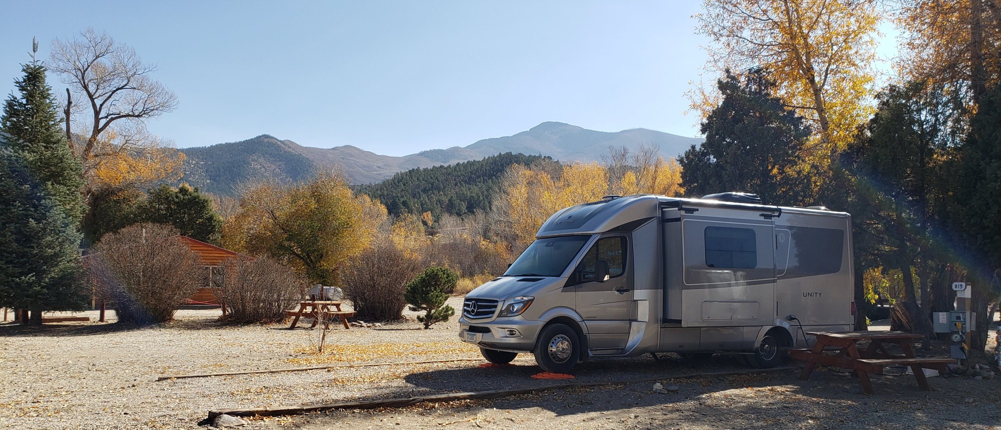 Oct 22-25 (Thursday-Saturday): At 10 AM Thursday, we headed off toward New Mexico. For the first part of the trip, the drive was easy and wind-free as we drove through the high plains along very straight roads. We did encounter some wind as our route wound along a pass through the Sangre de Cristo Mountains, reaching an elevation close to 9,000 ft, but the scenery was beautiful and there were very few white-knuckle moments. Our destination, the Questa Lodge and RV Park, proved to be a very pleasant, six-acre property with 40 RV sites (as well as several cabins), nestled at 7461 ft. elevation among the surrounding hills and mountains. The campground was only about half full, so we again had plenty of separation from the other campers, virtually all of whom kept to themselves at their own sites. We spent some time walking around, enjoying the small river and duck pond, and even broke out our bikes for the first time to ride to a nearby convenience store for supplies. The campground also had very good Wi-Fi service, affording an opportunity to make this inaugural post as well as to watch some TV with our streaming service.