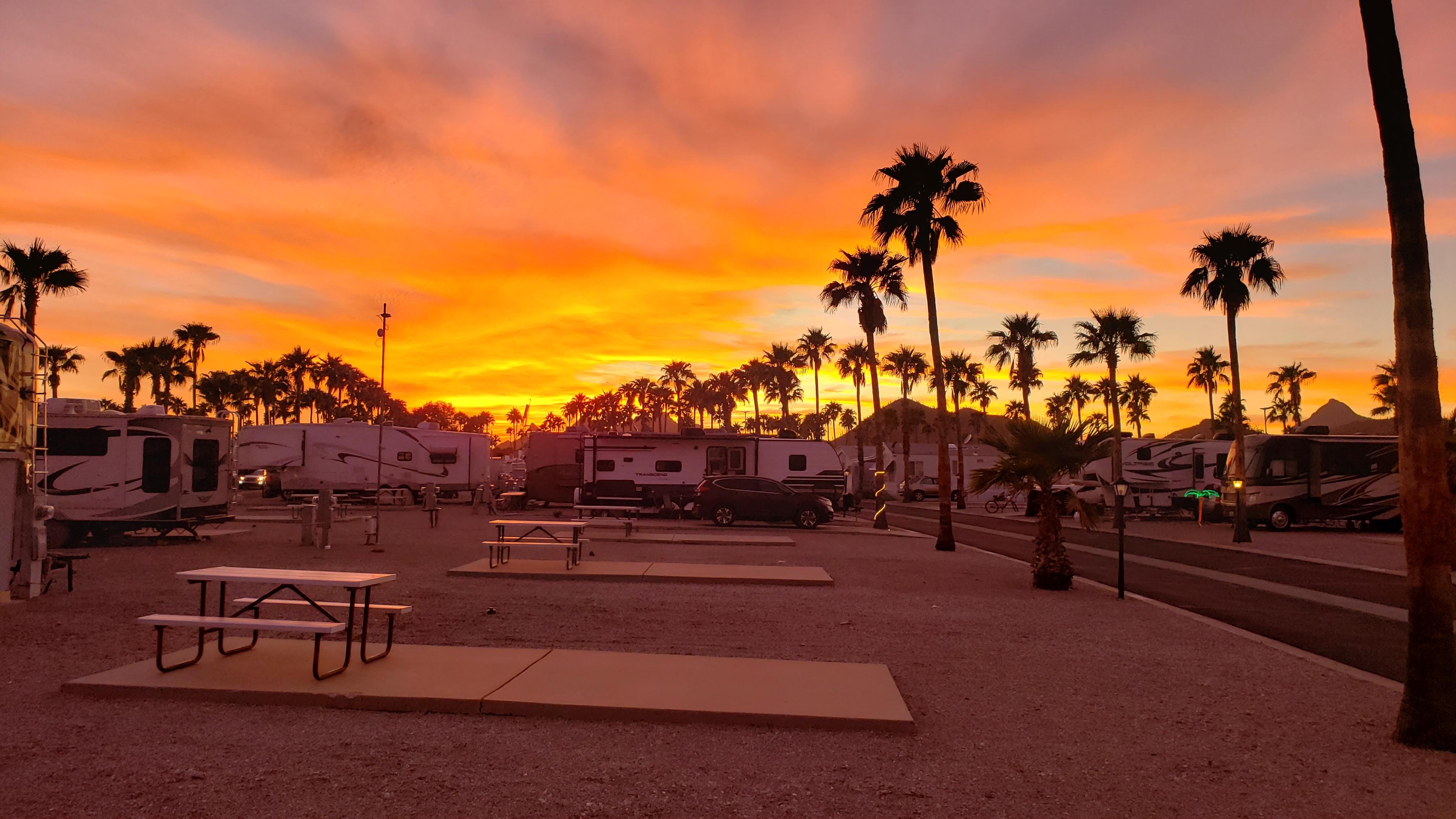 First, I should say something about the RV park itself. There are a total of some 1100 spaces, about half for RVs and half for permanent structures that look to provide about 400 square feet of living space. The grounds are nicely maintained with hundreds of palm trees, tall, sculpted evergreens, and many cactus varieties. Nicely manicured grass areas surround the office, pool, and common use buildings. The roads are paved and provide ready access to any and all RV and “park model” sites on the property. Our site is a few hundred yards away from a common building with clean and well-maintained laundry, restroom, and shower facilities. It’s a bit farther to the trash and recycling bins, but that provides some additional daily exercise. During normal times, we would have access to pickleball and tennis courts, a putting green and practice golf net, outdoor and indoor exercise equipment, and a host of community programs. But these are not normal times, so essentially no one is using any of these things. Almost all the residents are keeping to themselves and practicing social distancing when outdoors, save a few who gather in small groups to chat at various times. Masks are required inside the office, laundry, and other buildings open to the public. Many people are even wearing masks when walking around outdoors. When it isn’t too windy, we sit outdoors at our site and read or do puzzles before sunset – which is often quite glorious. Otherwise, most of our time at the park is spent inside the RV, safely sealed away from the other residents. In short, we feel very safe from Covid here.