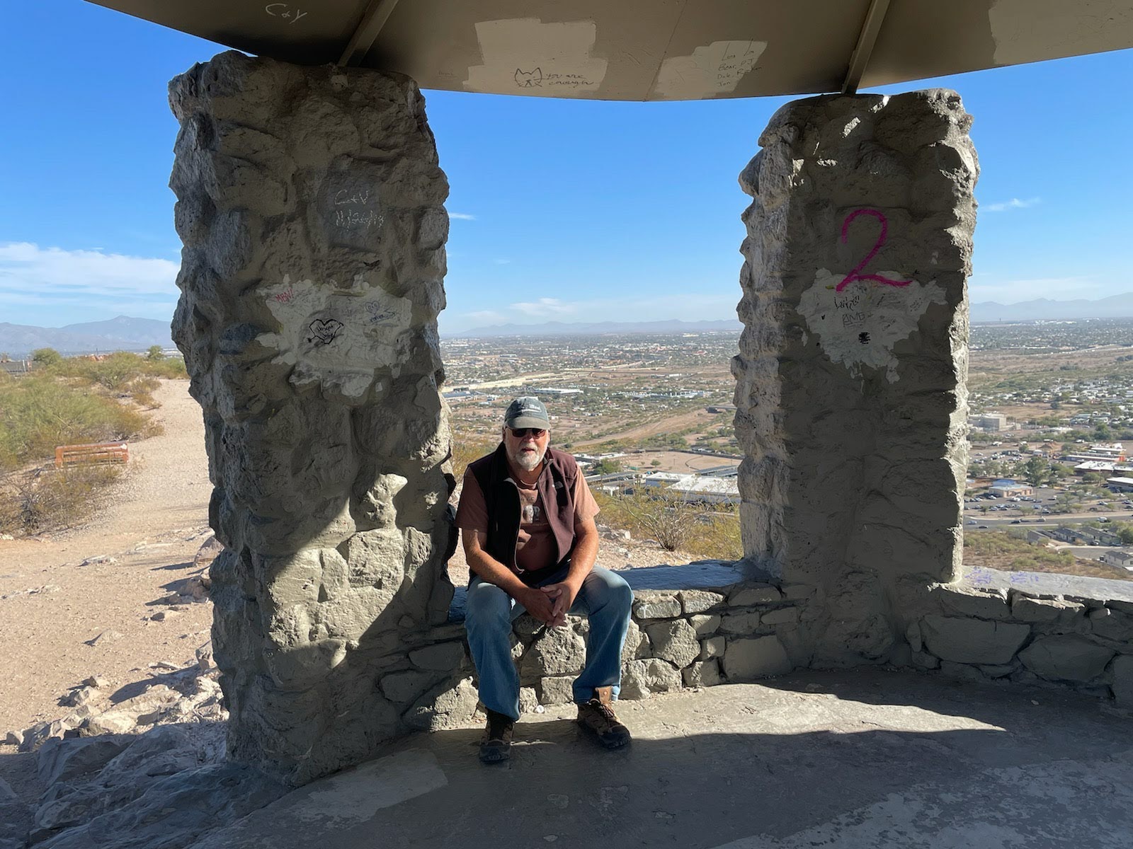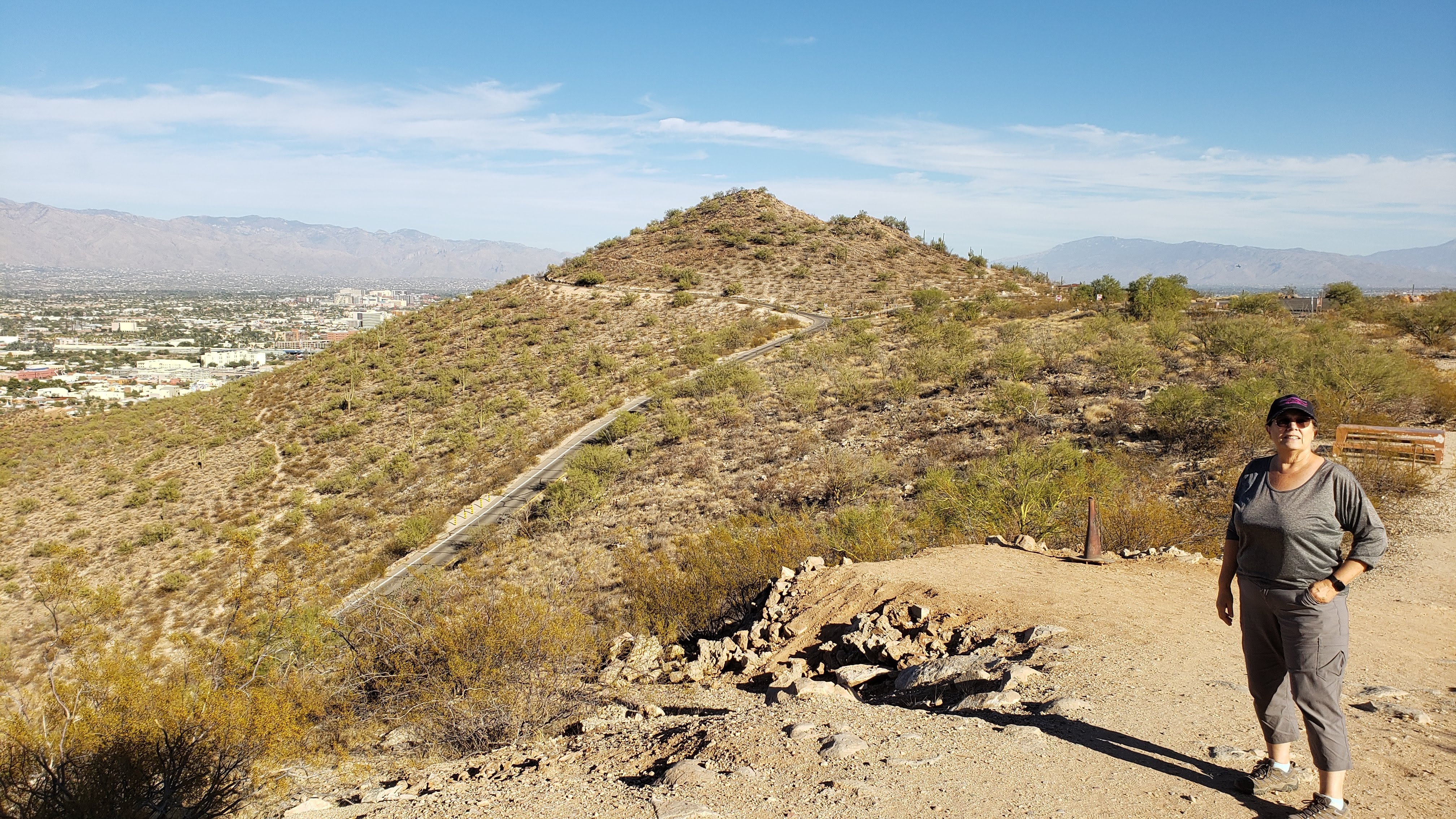 One Monday, we drove to the Sentinel Peak Park. This park is only about three miles from our RV Resort, within the Tucson city limits, but there is an elevation change of about 500 feet from the base to the summit, so we thought it would be good to drive to the top. However, as luck would have it, cars are not permitted on Mondays. We parked near the bottom and took a rather rough, winding trail for much of the journey up. We did end up walking along the road for the final ascent and back down again, mostly to avoid spraining an ankle or falling on my kiester. The views from the top were impressive, providing an excellent view of the overall Tucson area.