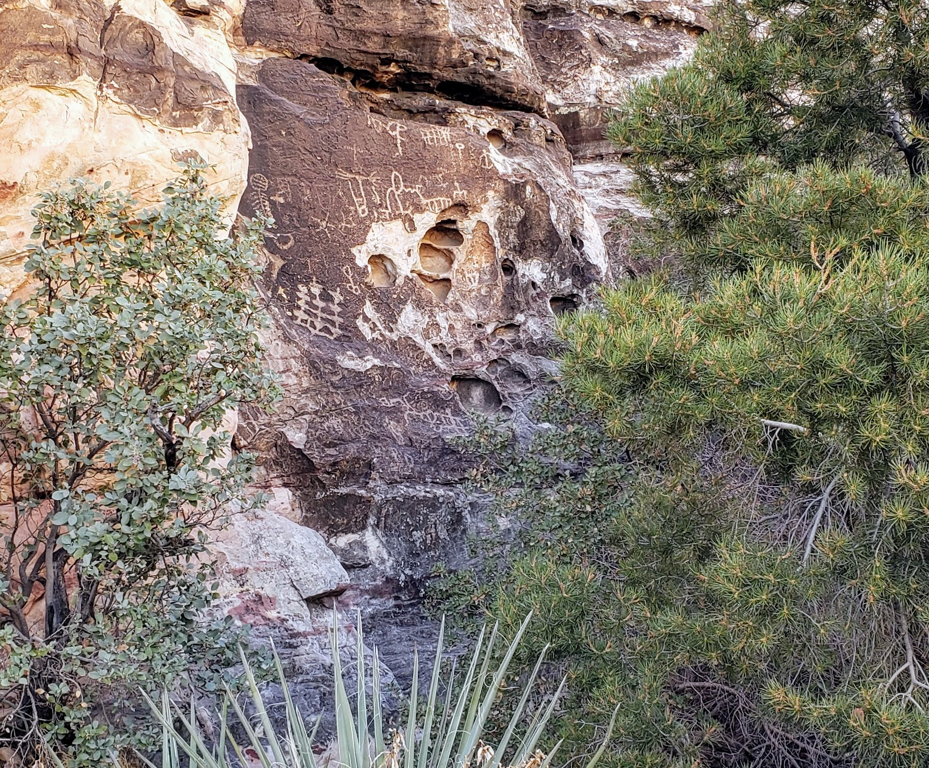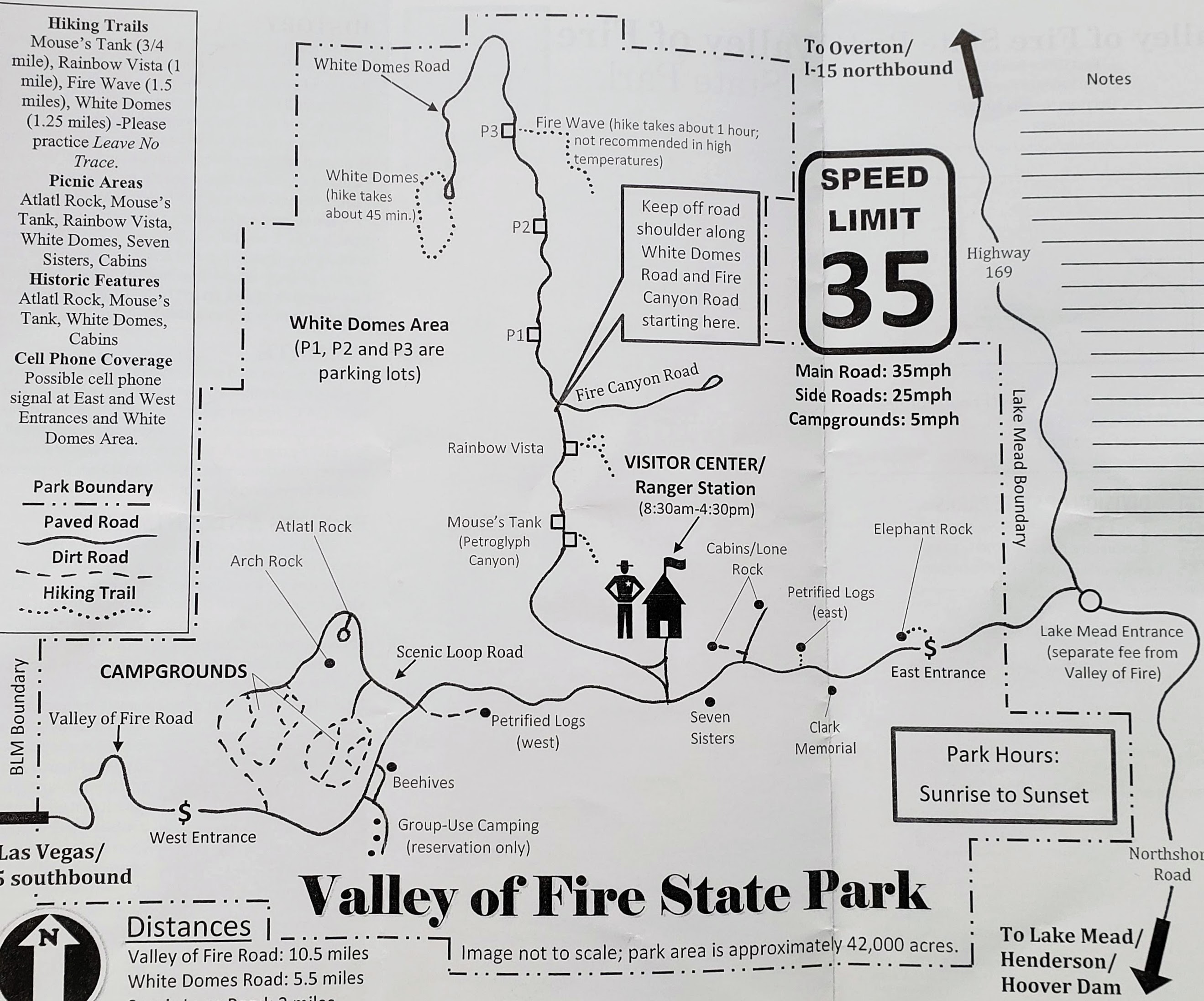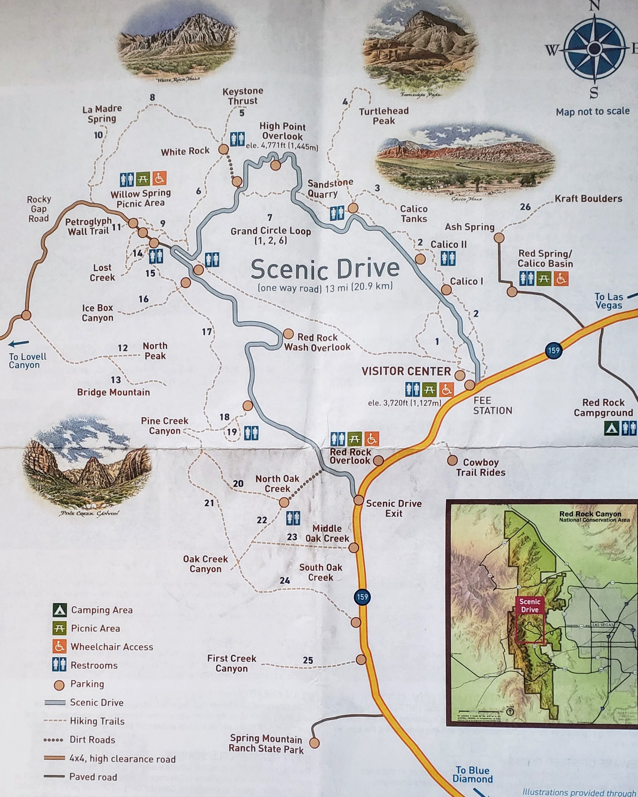 Red Rock Canyon National Conservation Area: This is a fabulous area about 18 miles northwest of the RV resort, operated by the federal Bureau of Land Management. Access is limited by a timed entry reservation system – on the BLM website one selects a desired entry time and pays an entry fee. (Lucky for us, my Lifetime Senior Pass gets us in for free!) Once inside the entry gate, there is a 13-mile scenic loop drive that winds among the many overlooks and trailheads. Pat and I drove around the loop on two separate visits, and we also hiked on the Visitor Center, Calico, Petroglyph Wall, and Lost Creek trails (see map below).