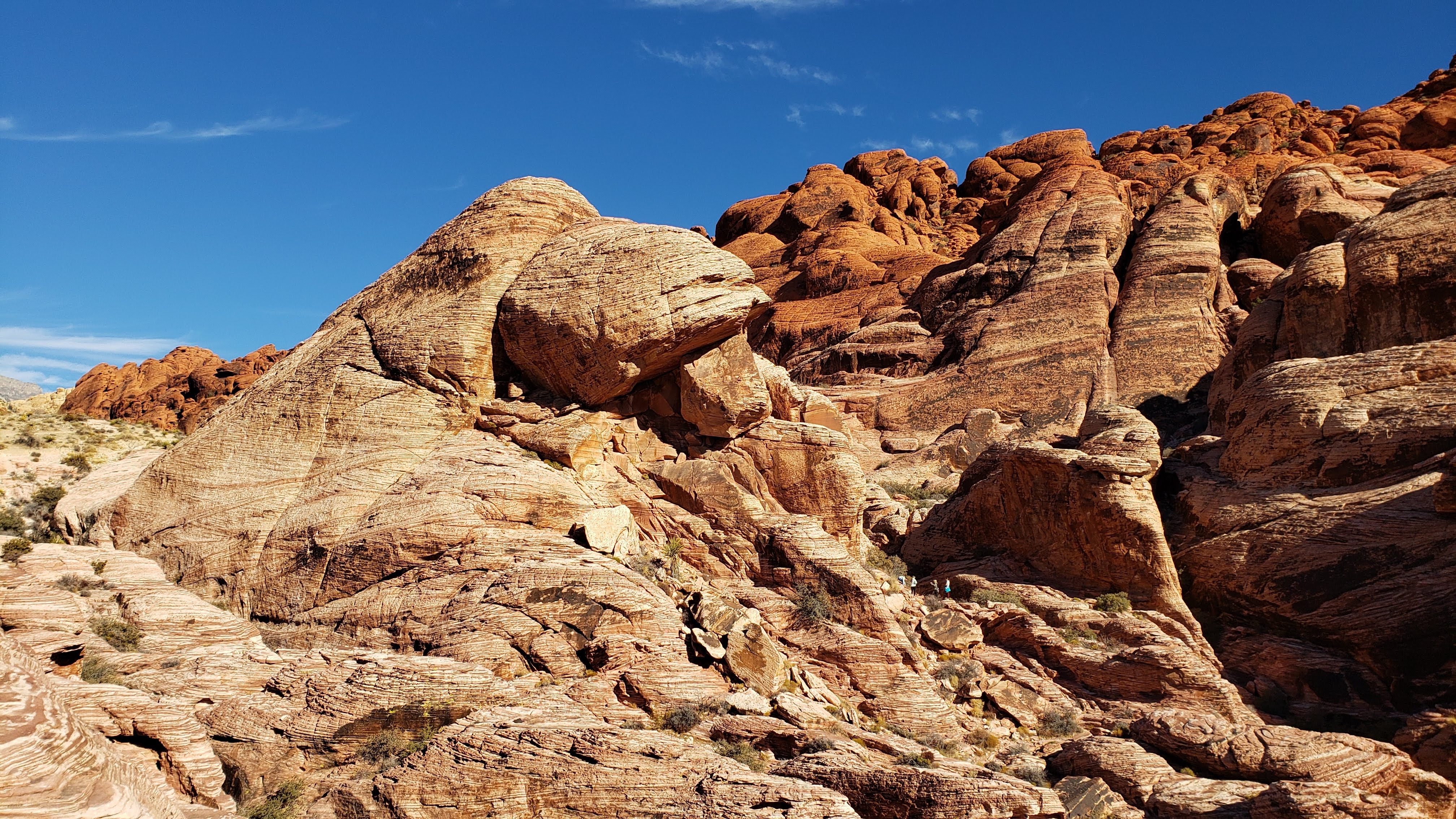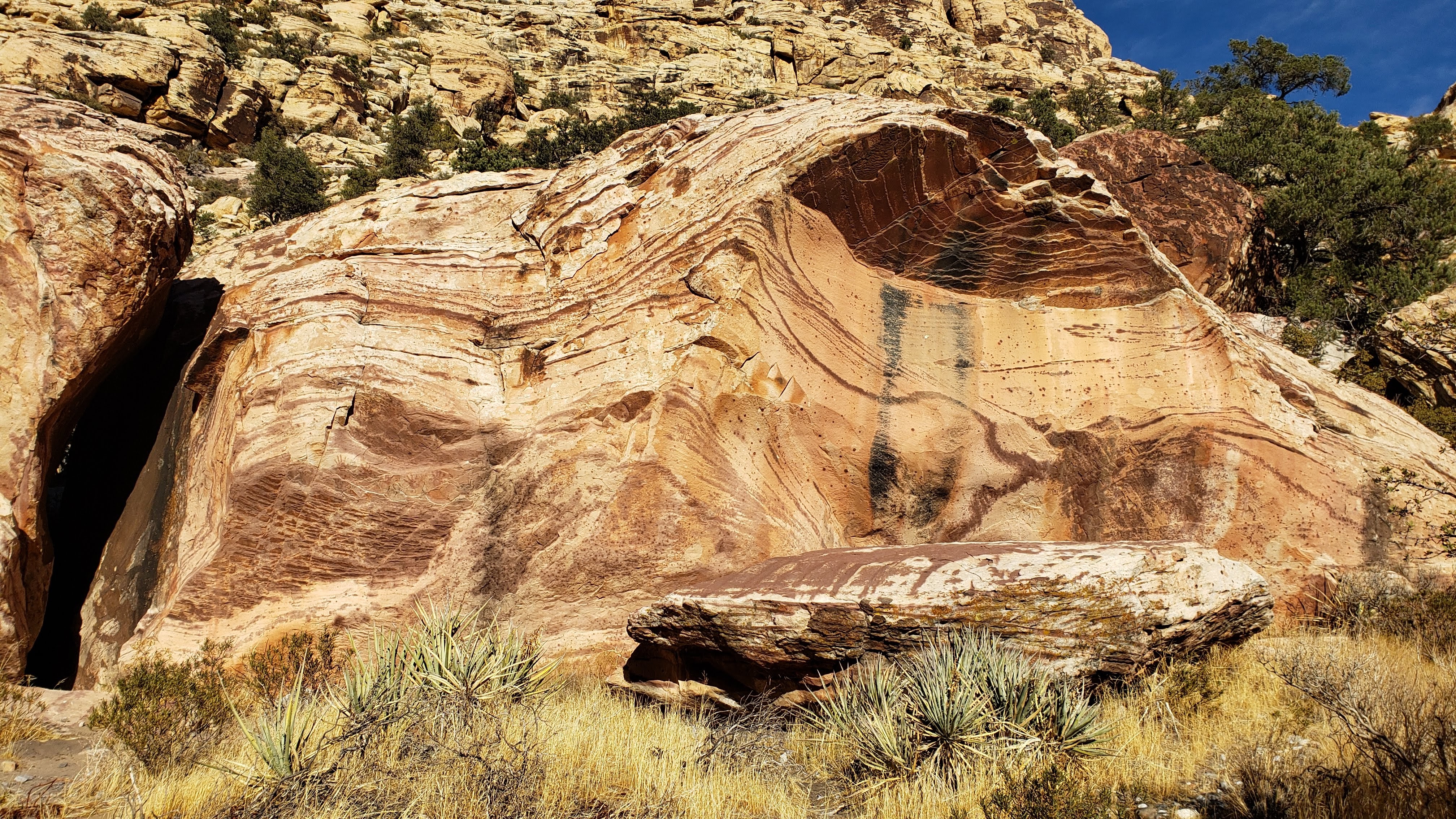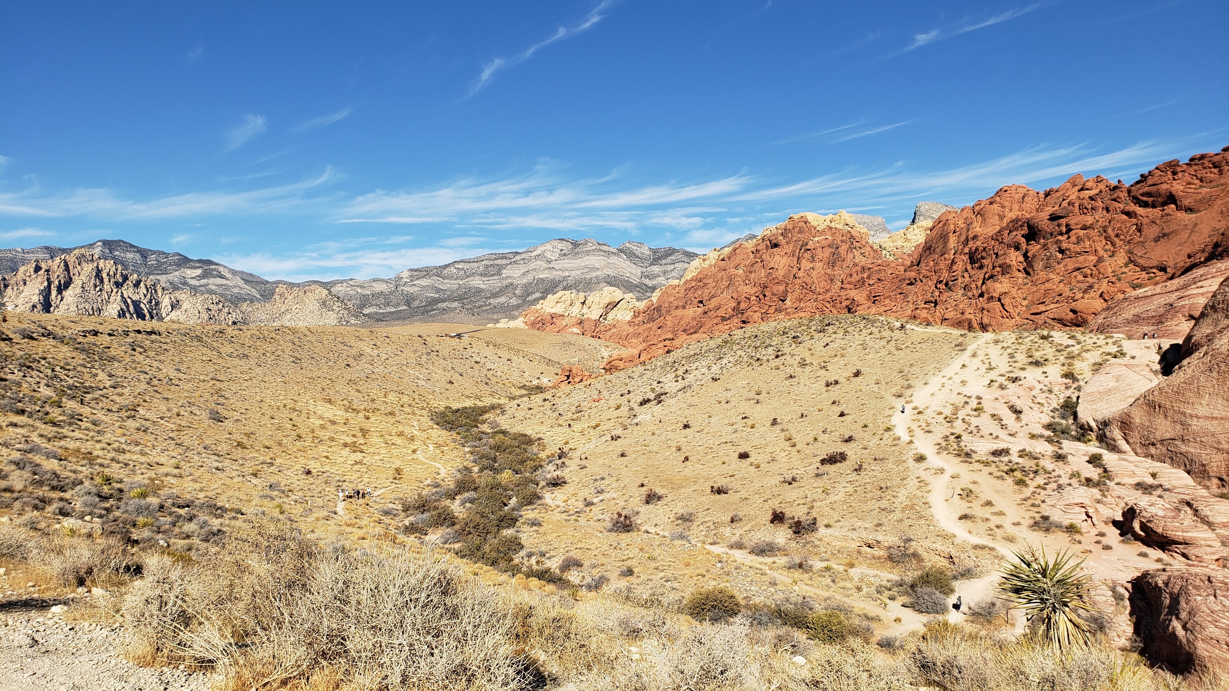 Red Rock Canyon National Conservation Area: This is a fabulous area about 18 miles northwest of the RV resort, operated by the federal Bureau of Land Management. Access is limited by a timed entry reservation system – on the BLM website one selects a desired entry time and pays an entry fee. (Lucky for us, my Lifetime Senior Pass gets us in for free!) Once inside the entry gate, there is a 13-mile scenic loop drive that winds among the many overlooks and trailheads. Pat and I drove around the loop on two separate visits, and we also hiked on the Visitor Center, Calico, Petroglyph Wall, and Lost Creek trails (see map below).