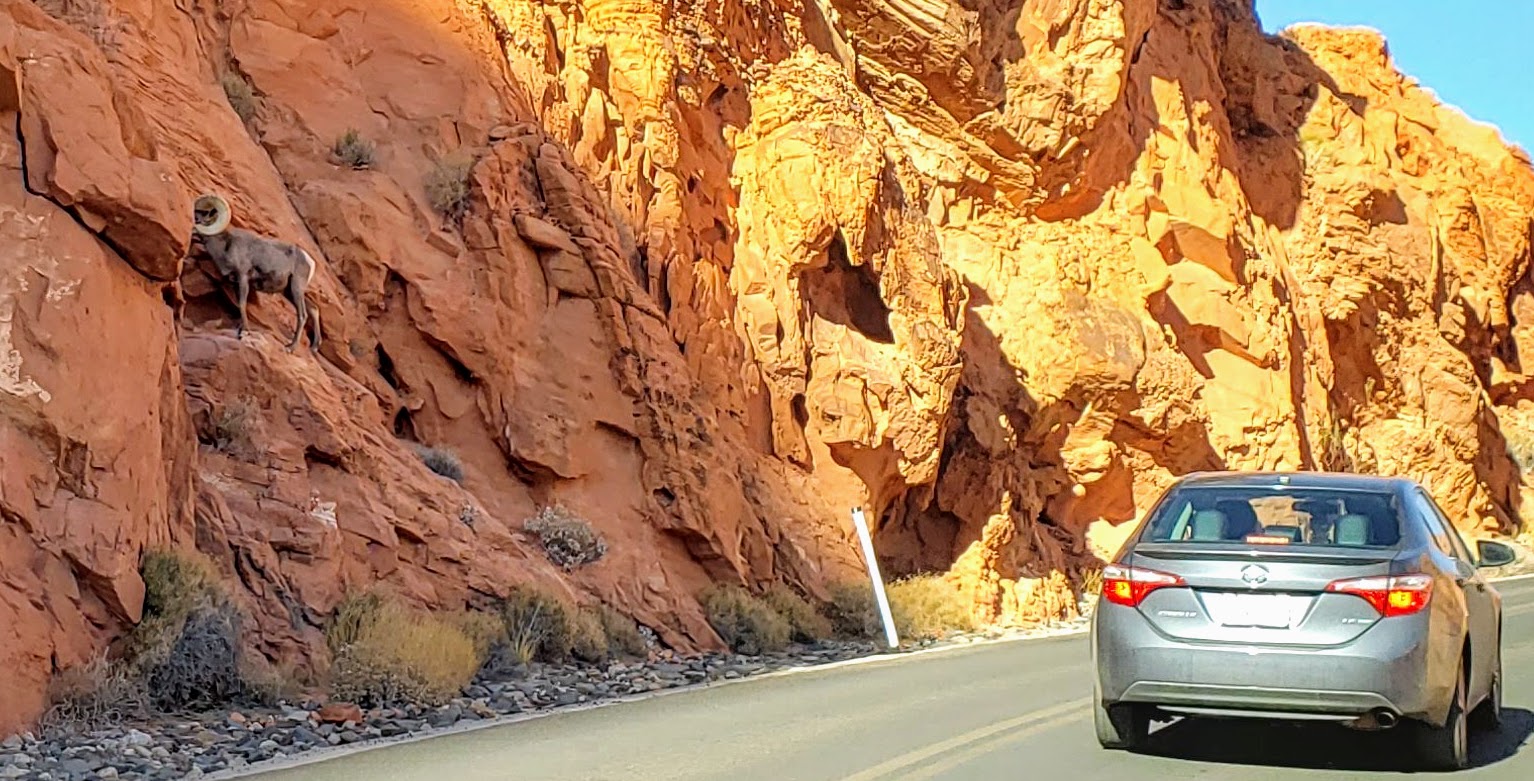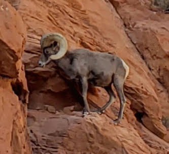 There are a number of access roads and hiking trails as shown on the map above. As we drove along the White Domes road just past the visitor center, we were greeted by one of the park’s natives – a bighorn sheep dashed across the road ahead of the car in front of us and leaped up onto a rock shelf.