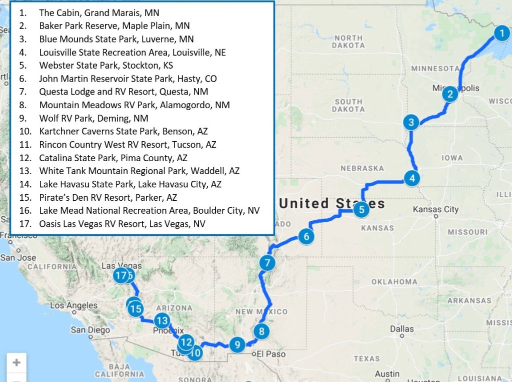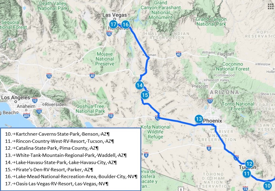 That covers our activities through today. When we arrived here in Vegas, we had planned to leave on January 27 to head for San Diego, where we had booked a two week stay. However, California subsequently entered Covid hell, so we cancelled that reservation. Currently, our departure date is somewhat open – between January 28 and February 14. So here we are, vacillating in Vegas about where to go next. Unfortunately, the weather in much of the southwest has gotten rather cool and the coming weeks’ forecasts are for rain and cold, so no place seems particularly enticing right now. Who knows when or where we will be when I write the next installment? Perhaps only The Shadow knows. The good news is that we are still feeling safe and well.