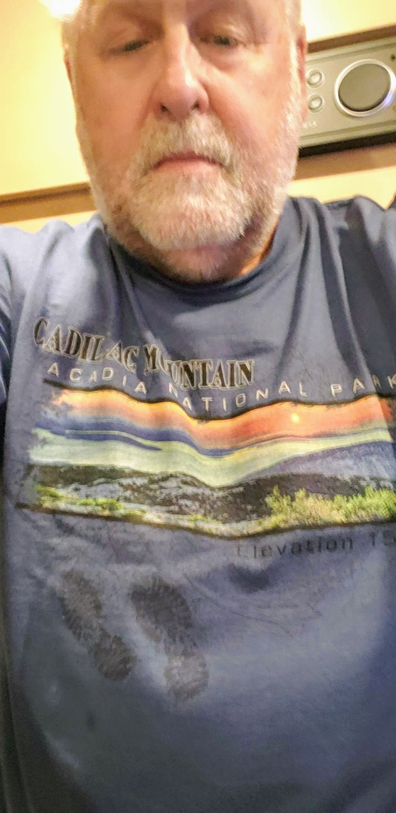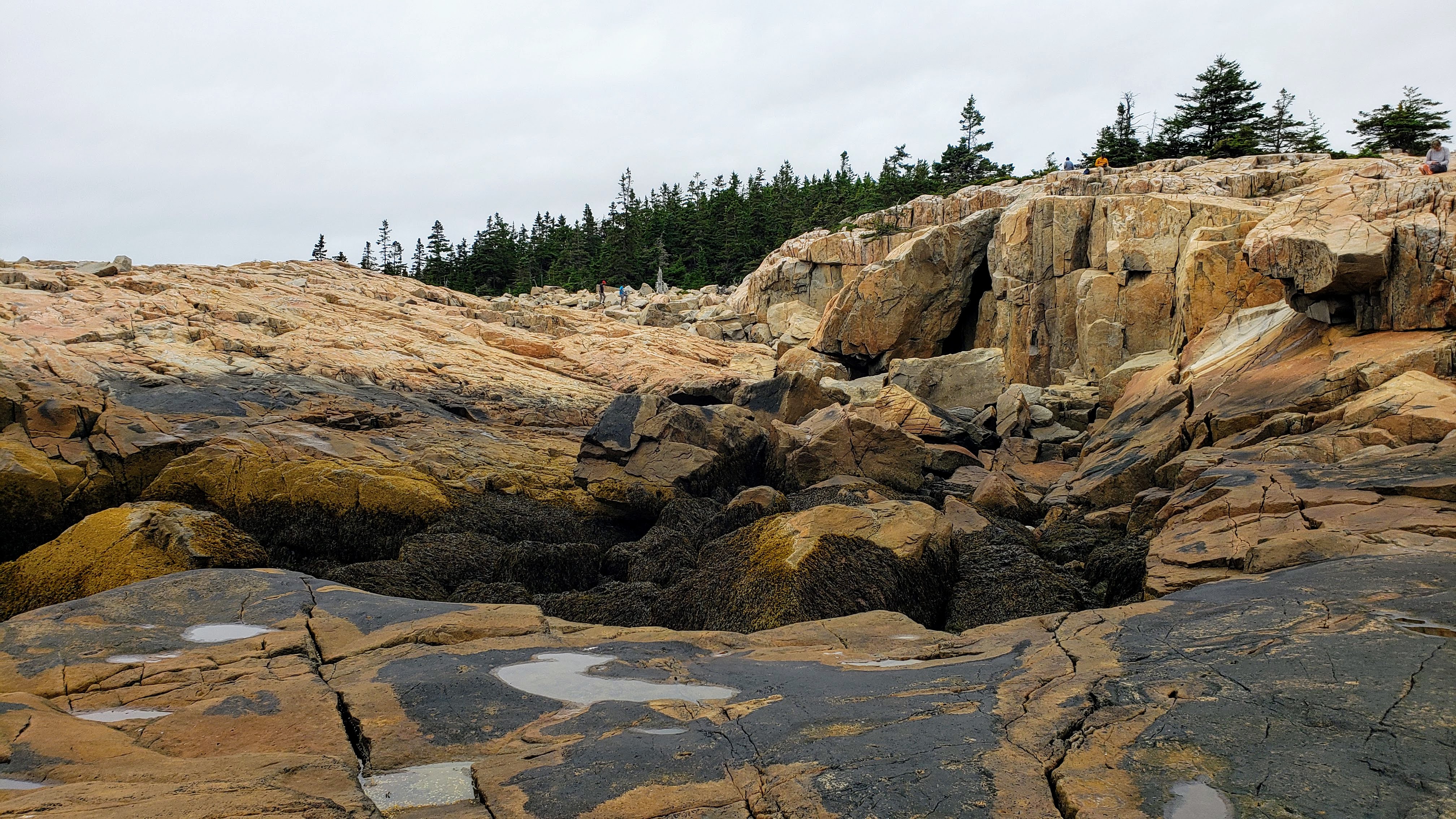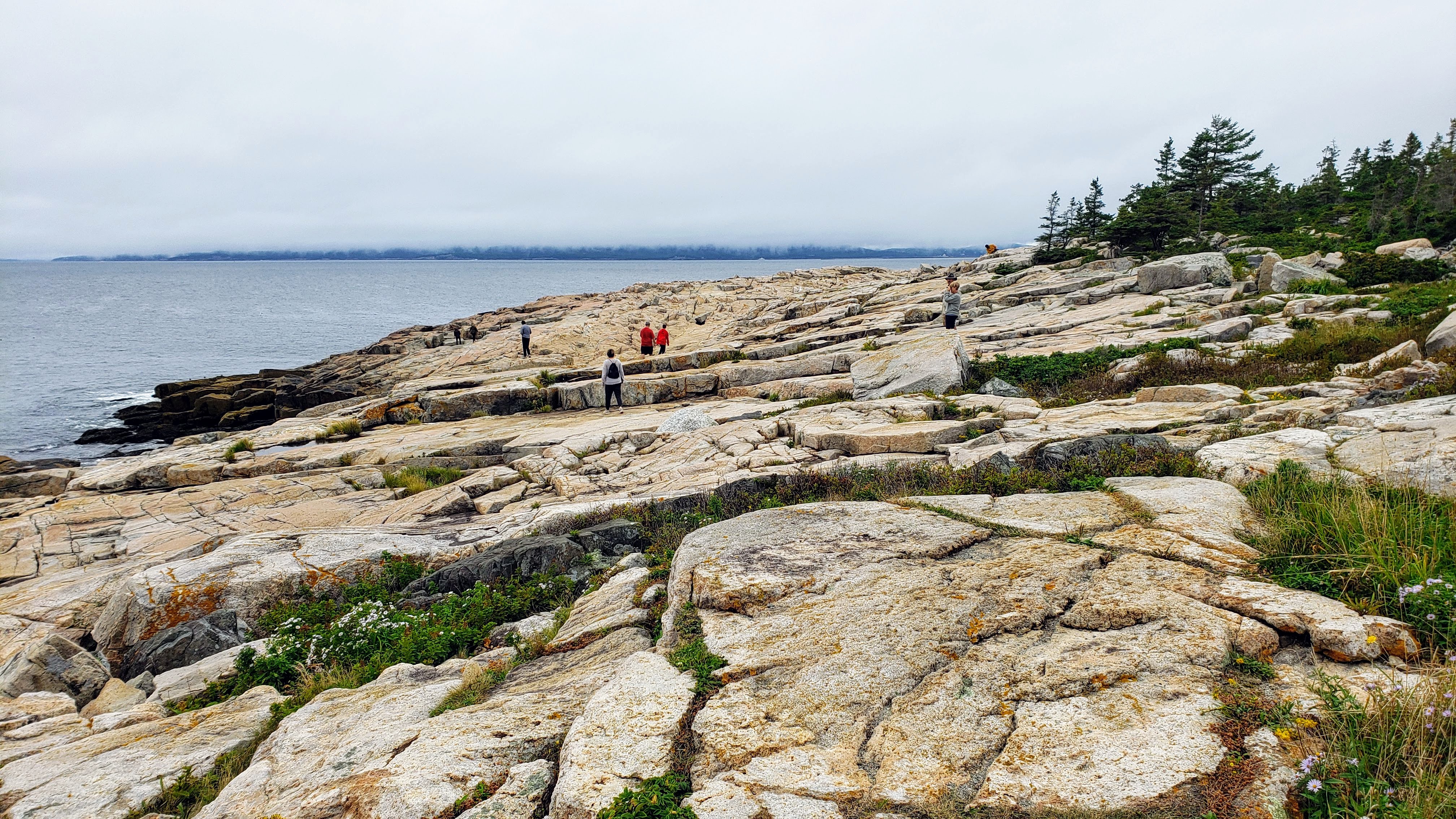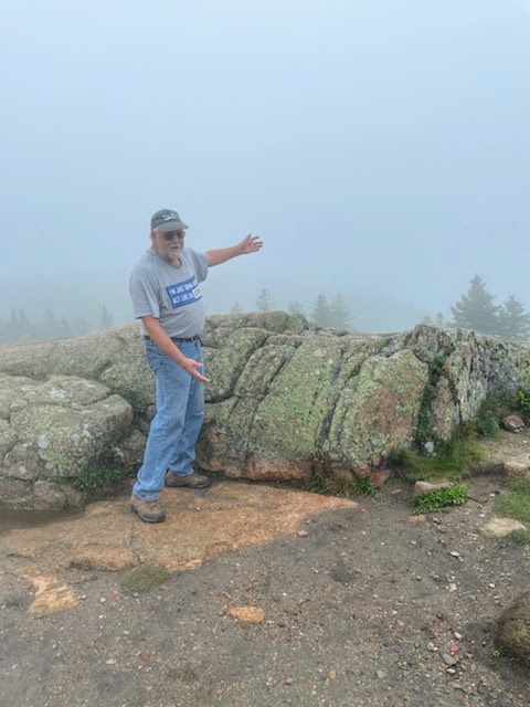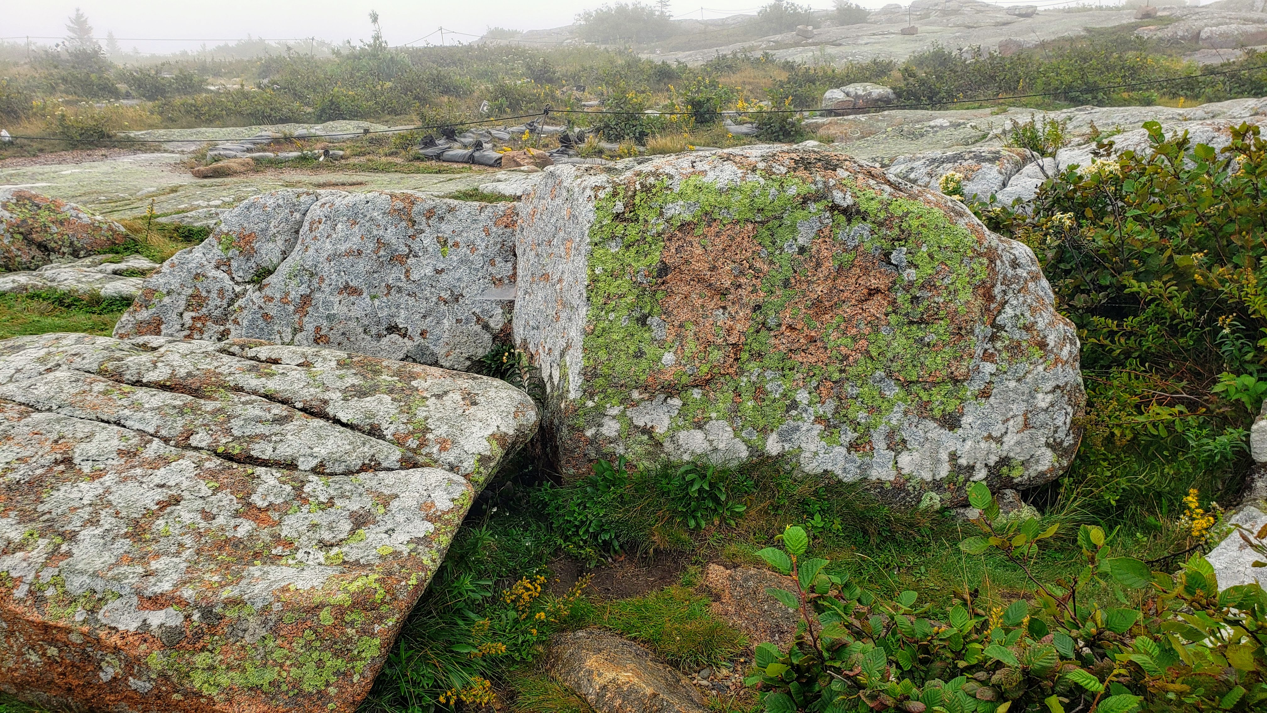 Despite the weather, we did enjoy some nice hiking on the trails at the top of the mountain. The rock formations and vegetation were particularly interesting. Cadillac Mountain granite has a pinkish tint, and prolific lichen growth gives it a unique appearance. And, at the end of our visit, I did get a cool T-shirt at the gift shop.