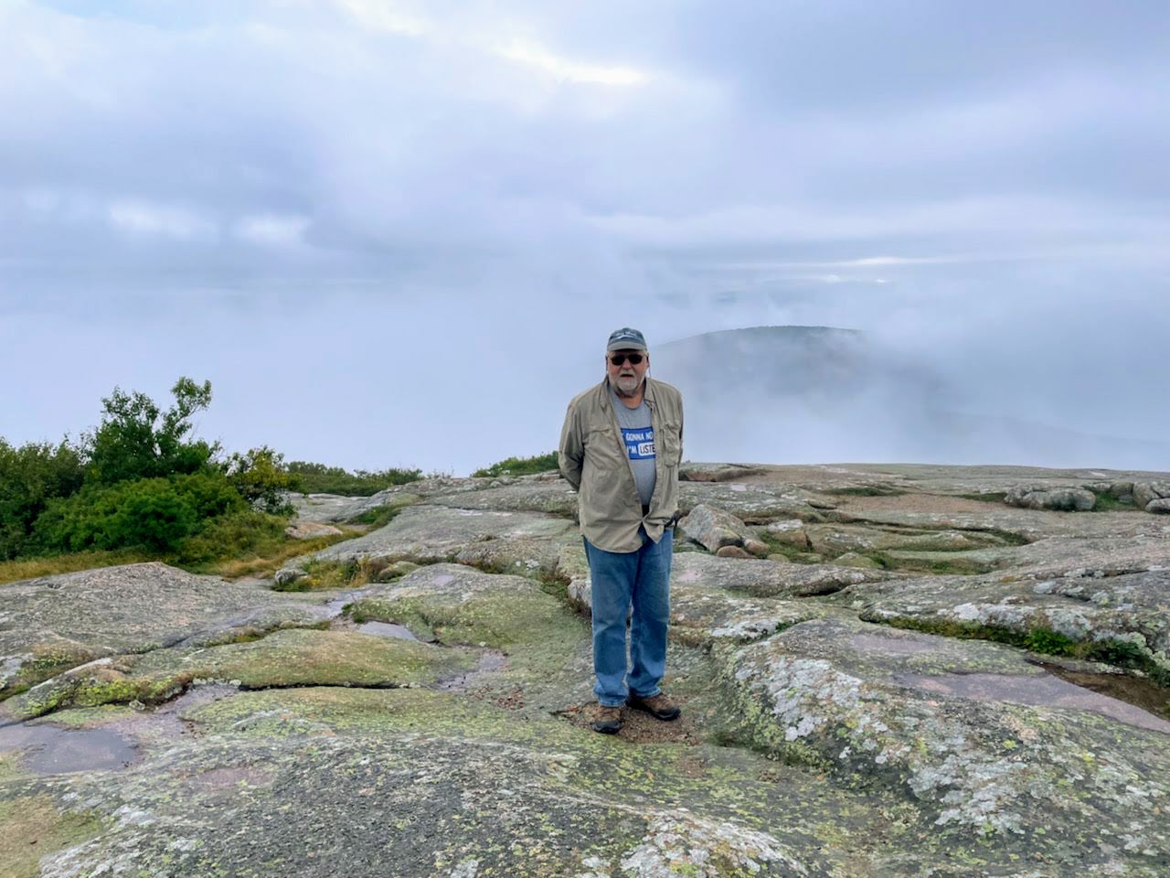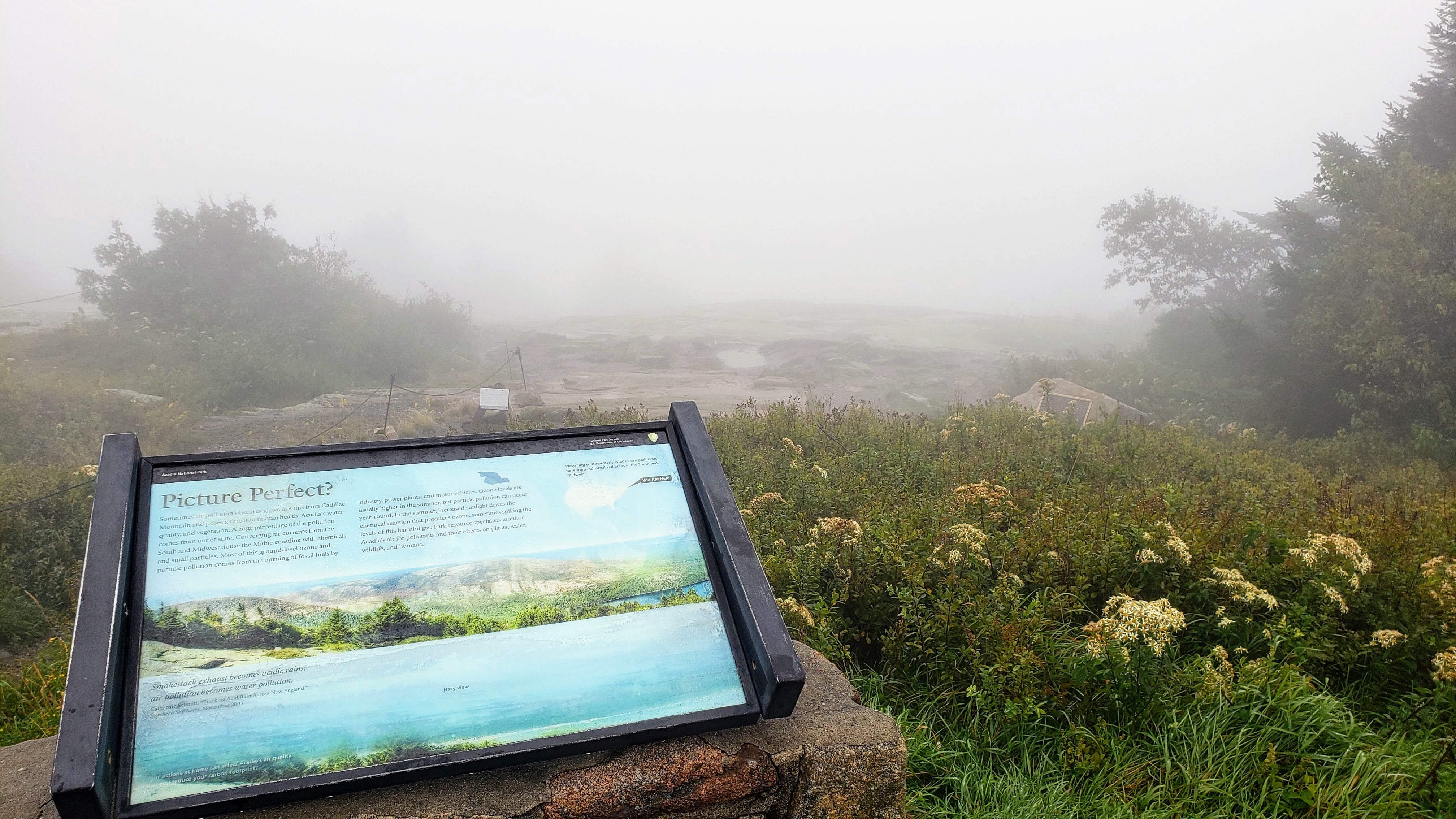 On Monday, we drove from Schoodic Woods to the main park sector, where we had reserved a 10 AM time slot to drive up to Cadillac Mountain. Even though all we were doing was going from one part of the park to the other, the drive was 42 miles around the bays and took well over an hour. We had reserved this time way back in July, and the NPS does not allow one to make a second reservation on the same day, so there was no opportunity to change the time – we just had to go. The reason I’m lamenting this inflexibility is that Monday morning came with pea-soup fog and intermittent drizzle. As I drove the Tesla up the winding road to Cadillac Mountain, there were places I could not see ahead more than 100 feet. So, when we got to the top, the expected spectacular views of the ocean and surroundings were, well, not exactly spectacular. All we could do was adopt a Zen-like attitude and imagine what we were missing. At least there were some nice signs with pictures of what we could have seen on a clear day.