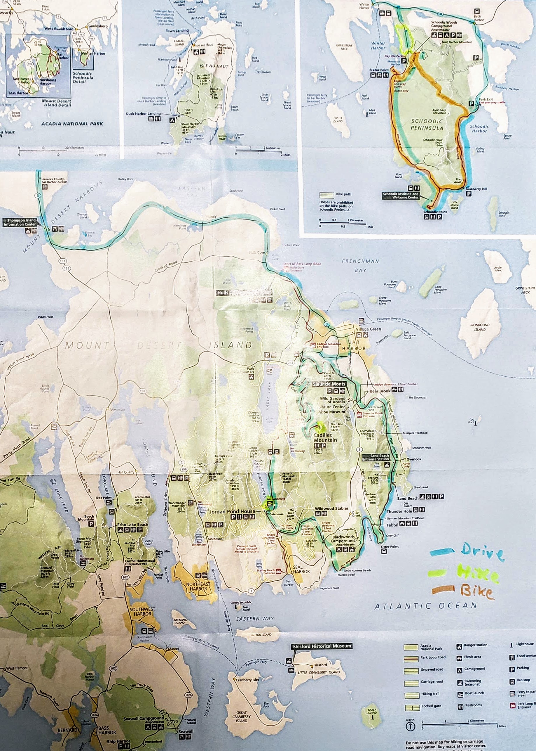 In short, Acadia is AWESOME. We had a fantastic RV site at the Schoodic Woods Campground, located in a newer portion of the Park on the Schoodic Peninsula, across Frenchmen Bay from the main part of the Park located on Mount Desert Island. Here’s a rather poor photo of the park map indicating the various roads and trails we drove, biked, and hiked on during our stay.