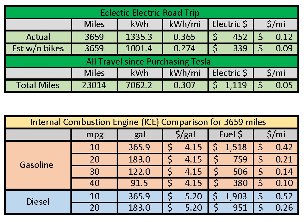 The ICE fuel costs are based on driving the same 3659 miles as we did on our Eclectic Electric Road Trip and using rough averages of gasoline and diesel prices that we observed on the trip. As you can see, fuel costs for the Road Trip with an ICE vehicle would have been higher unless the car was very efficient and got 40 mpg or more. And for fuel hogs getting only 10 mpg, like the 4×4 pickups that raced past us at 85 miles per hour on the freeways or big, diesel-powered RVs, the fuel cost for this trip alone would have been significantly more than the total we have spent to charge the Tesla in its first 23,000 miles! Of course, the cost of ownership for a vehicle is much more than just the fuel costs, and gas and diesel costs are not going to remain as high as they are now forever. But other costs for an electric vehicle are also lower. For example, there are no oil changes or tune-ups, electric motors are highly reliable and require essentially zero maintenance over the life of an EV, and there is virtually no wear on the brakes due to regenerative braking. (I’ve probably stepped on the brake pedal less than twenty times in those first 23,000 miles.)