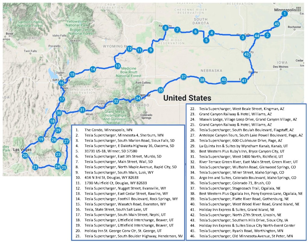 The list includes every stop we made at a Tesla Supercharger and every Airbnb or hotel/lodge location where we stayed. It does not include all the places we visited on tour buses or shuttles, but those are described in the previous posts. The highlights were the Road Scholar golf school, Pat’s biking in St. George, and our visits to the canyons – Zion, Grand Canyon, and Bryce Canyon National Parks as well as Antelope Canyon. The beautiful scenery during our drives as well as stops at many miscellaneous roadside scenic overlooks that I have not mentioned in the blog posts was definitely icing on the cake. We thoroughly enjoyed the Eclectic Electric Road Trip and will not hesitate to do another one with our Tesla in the future.
