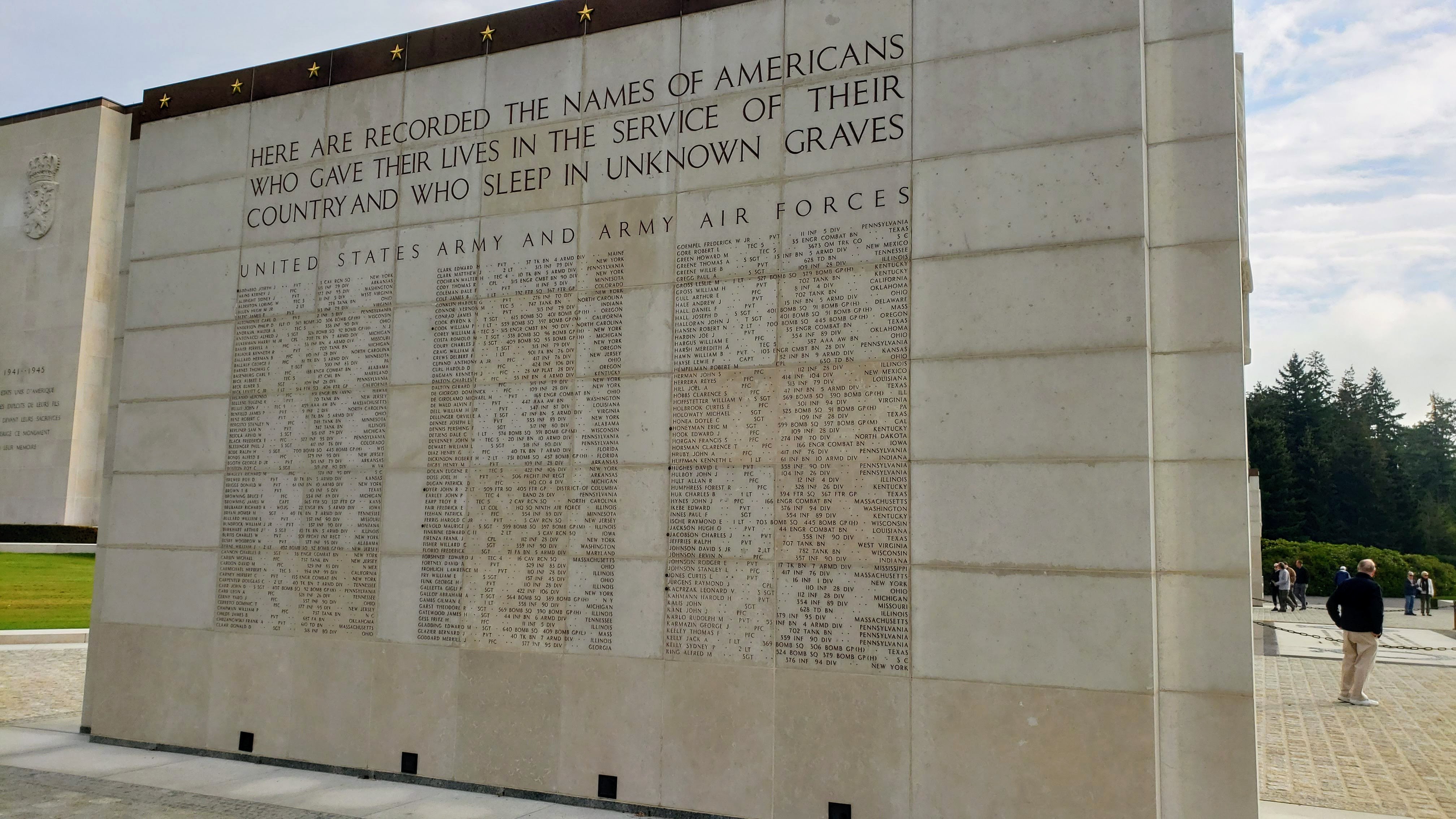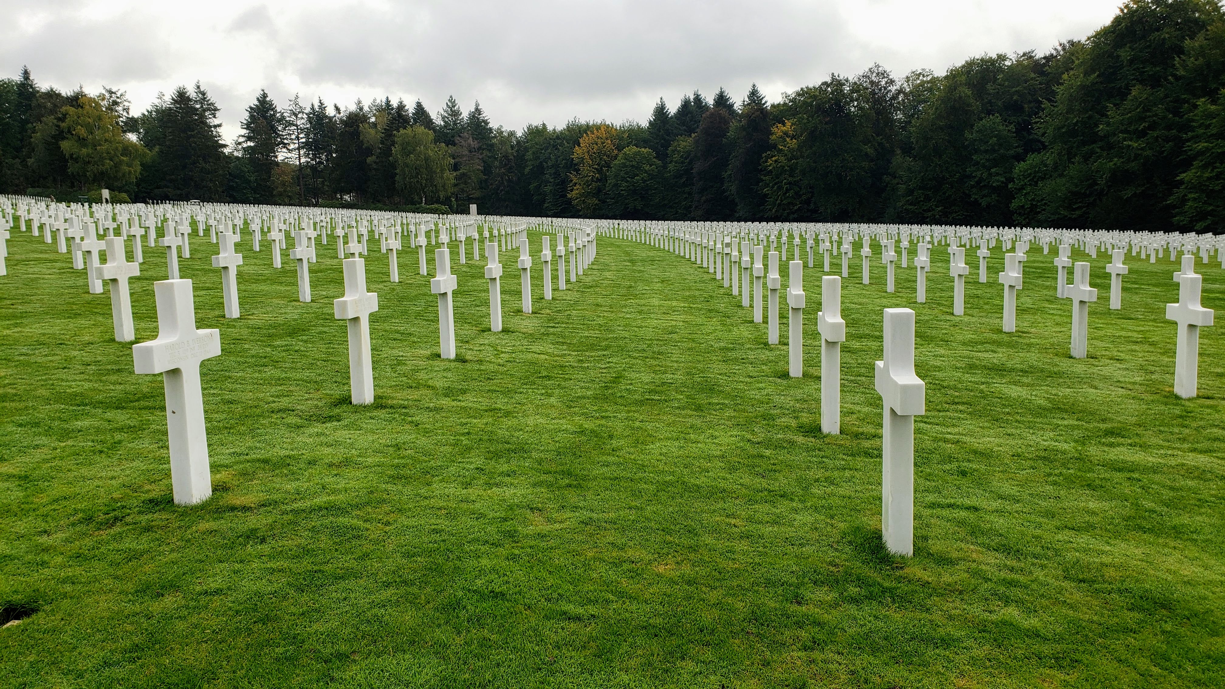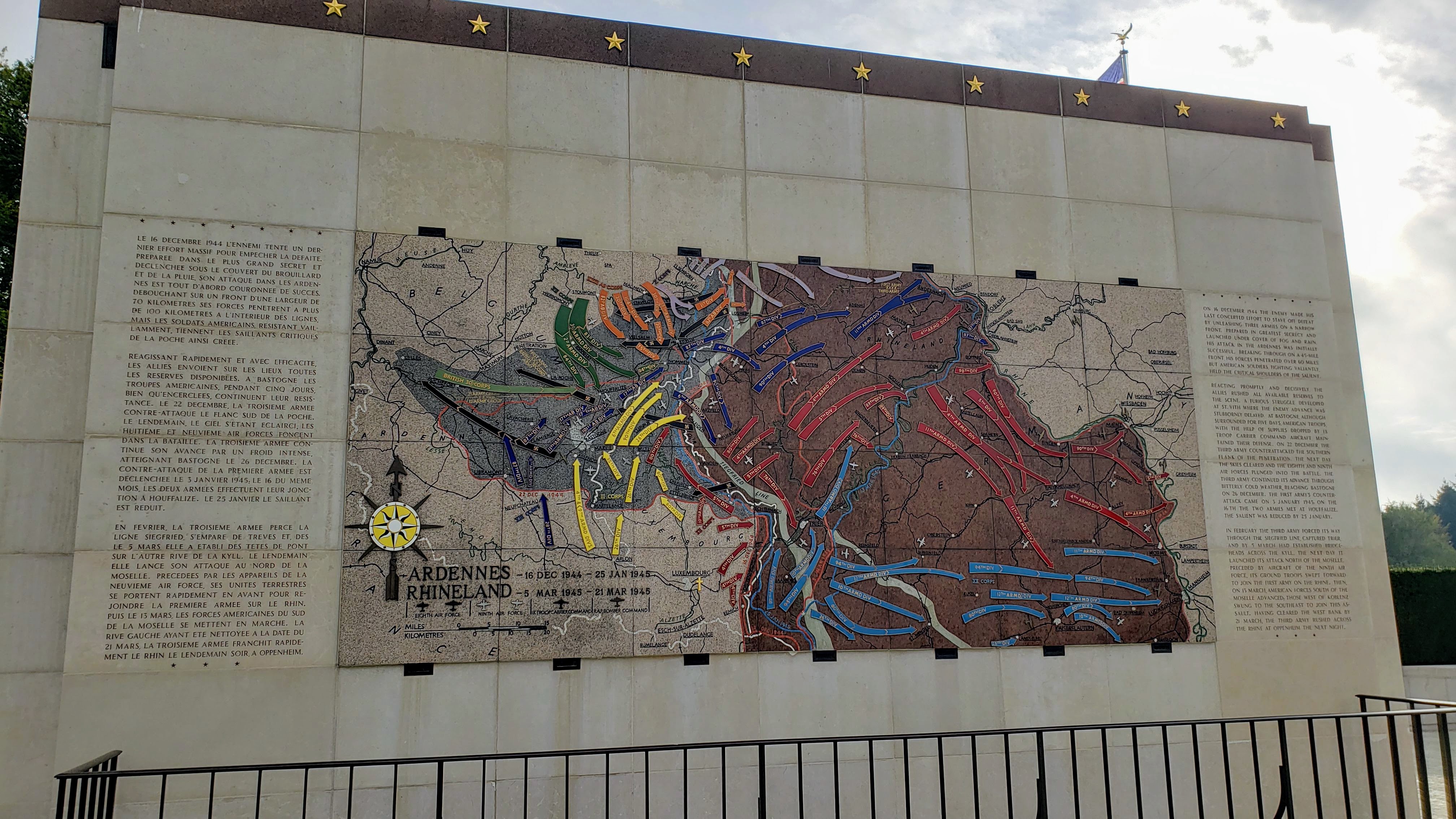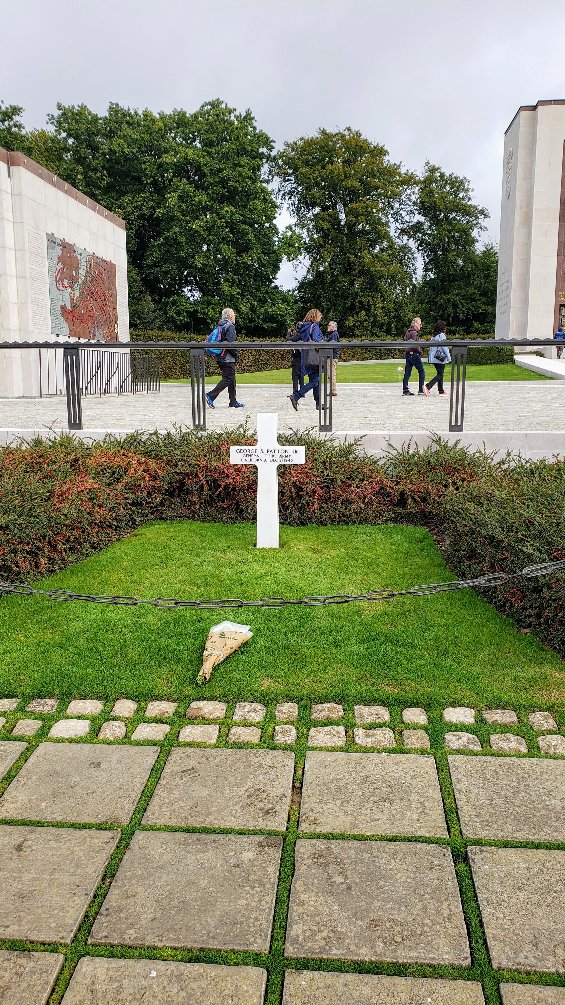 Sep 26 (Monday): After breakfast, our final meal aboard ship, we boarded our bus at 8 AM for the trip to Paris. There were two stops along the way, which helped break up the journey as well as provide more interesting things for us to learn about. The first stop was the Luxembourg American Cemetery and Memorial, near the site where the famous Battle of the Bulge (also known as the Ardennes Offensive) was fought in World War II. The cemetery was established on December 29, 1944 by the 609th Quartermaster Company of the US Third Army while Allied Forces were containing the final German offensive of the war. It was formally dedicated in its current state in 1960 and is administered by the American Battle Monuments Commission. It contains the graves of 5,074 American soldiers, including that of General George S. Patton, as well as tablets listing the names of 371 missing in action. The grounds are immaculately tended, with the graves arrayed in an arc so each one faces toward the US, and there are many informative plaques commemorating the soldiers and providing historical information, such as maps illustrating the major battle movements. I found the place to be very moving – a solemn reminder of the costs of war.