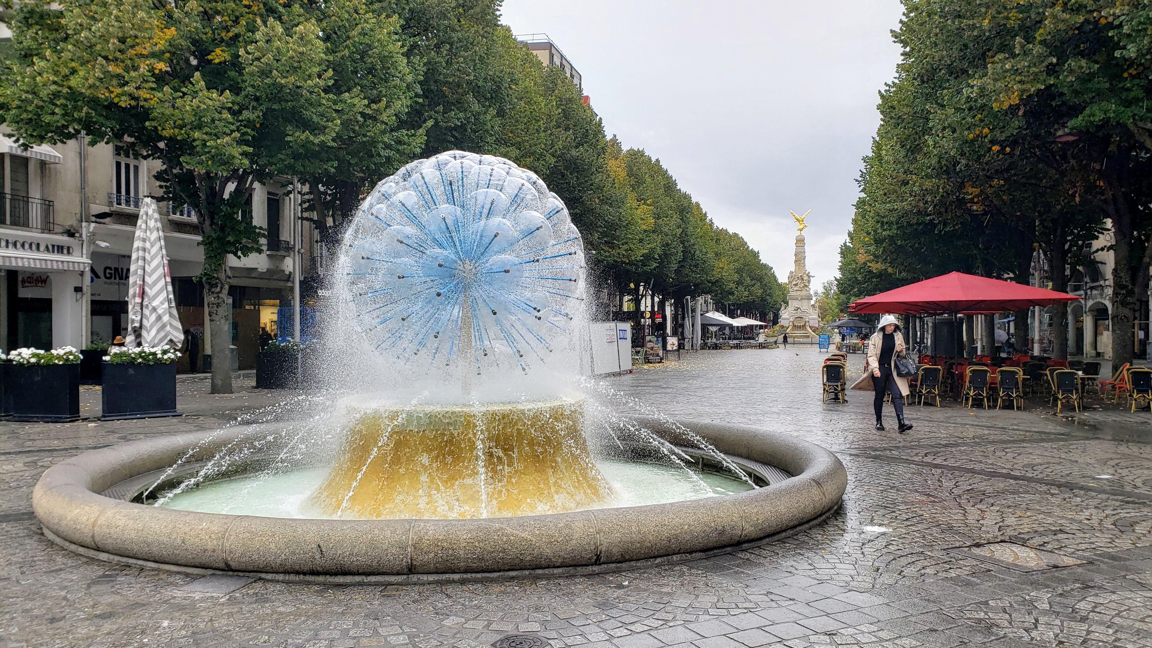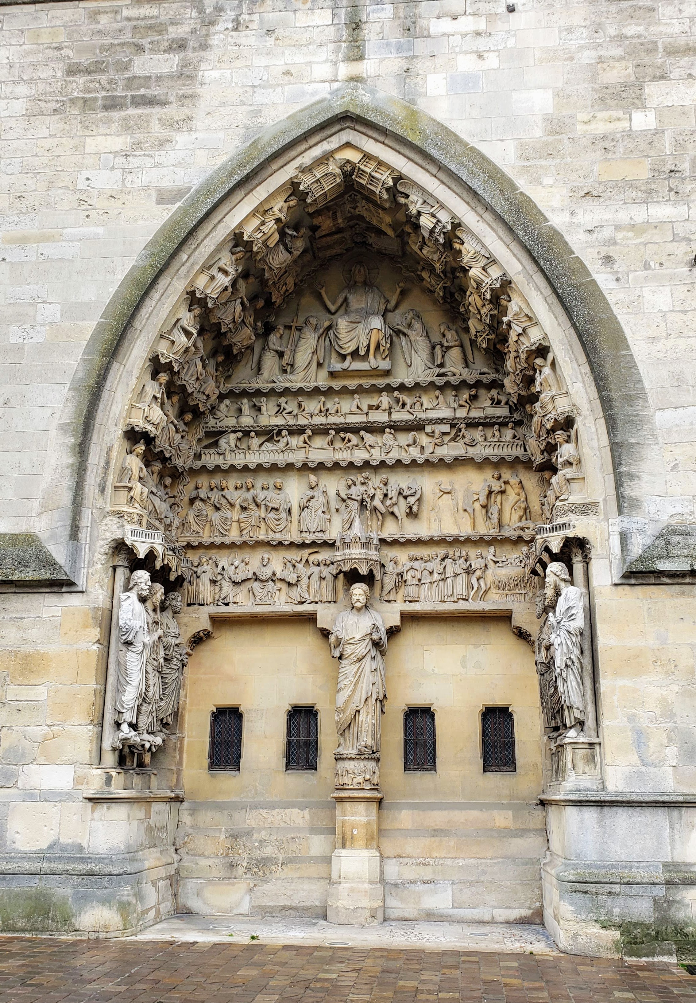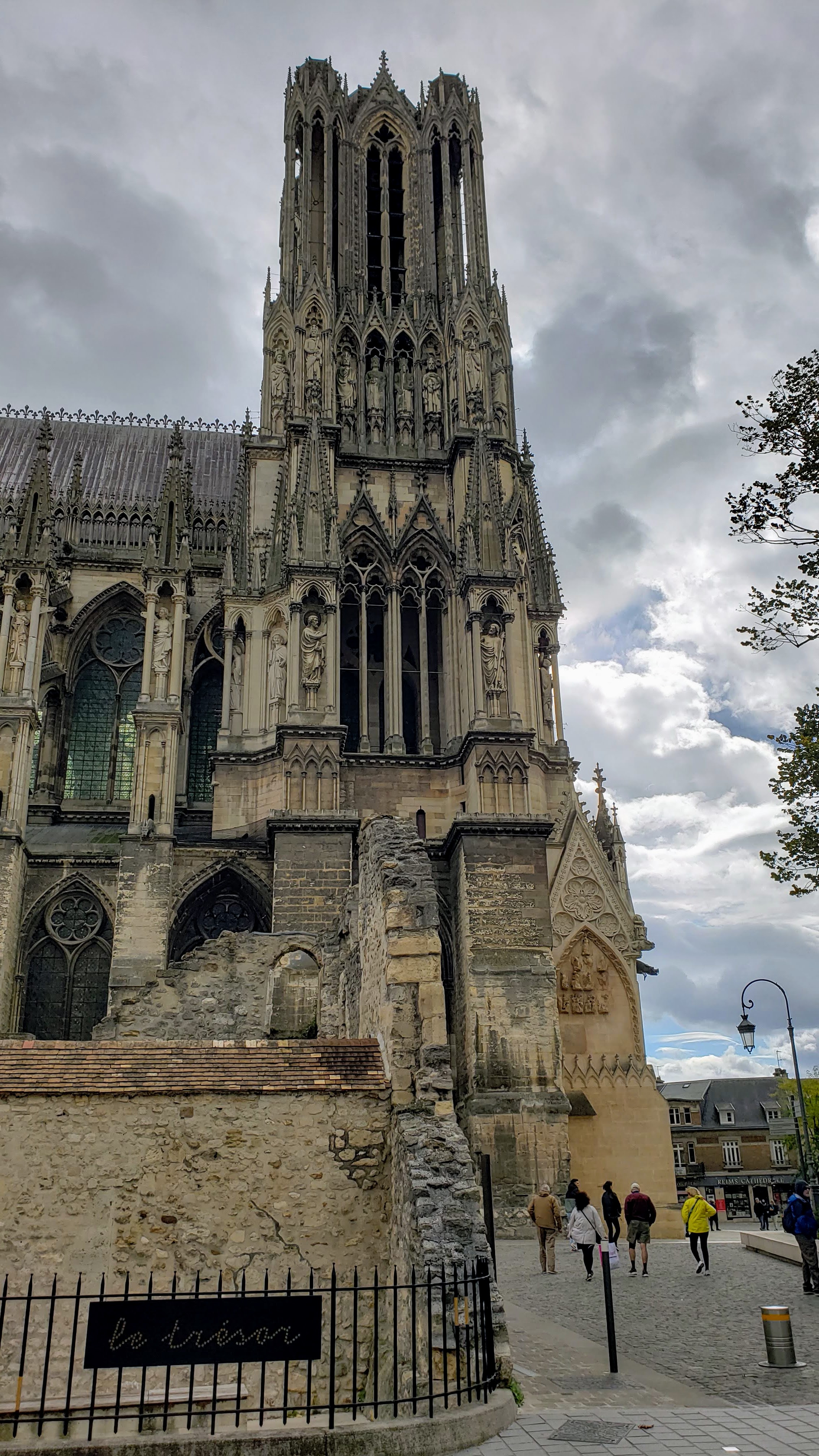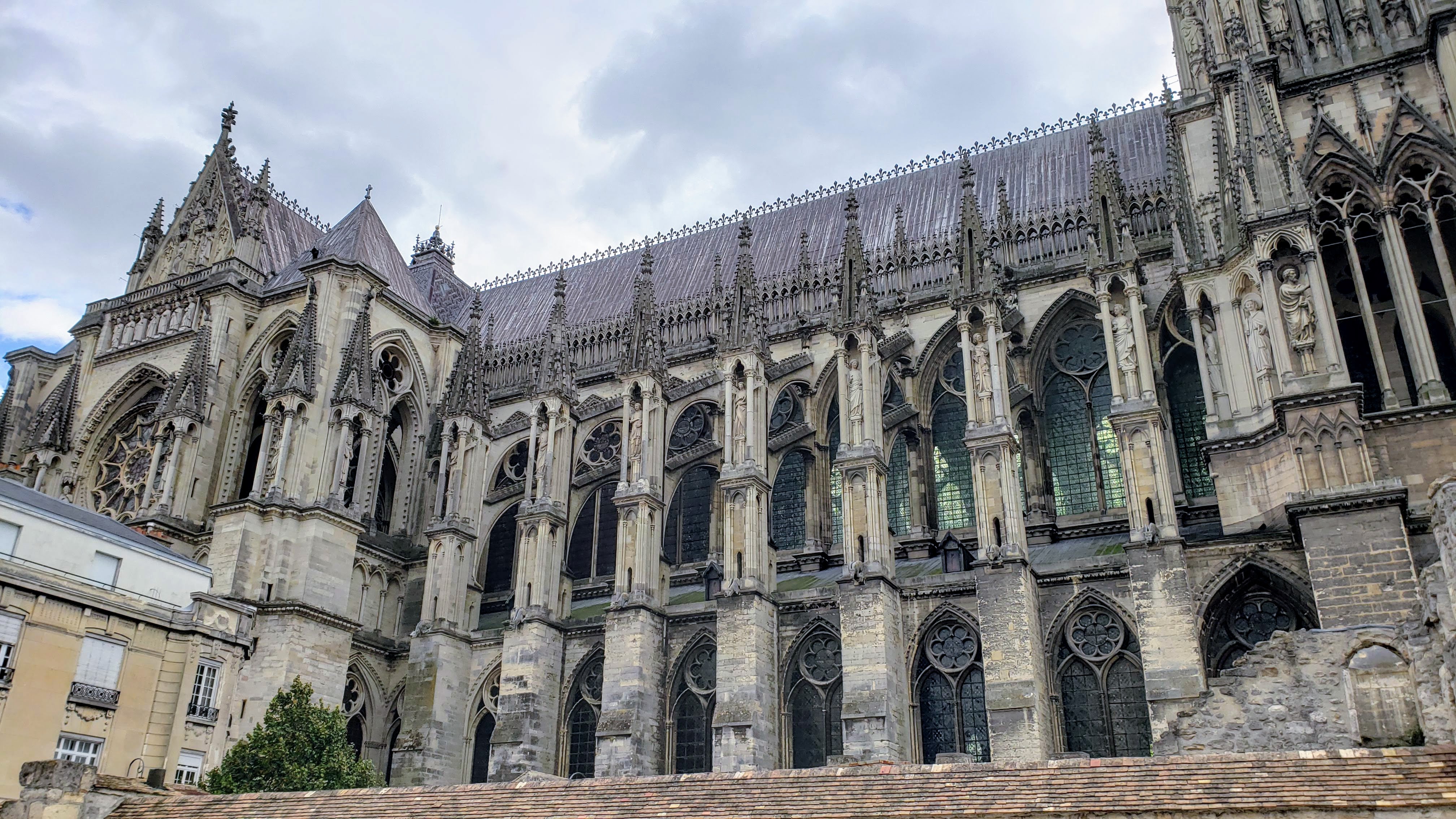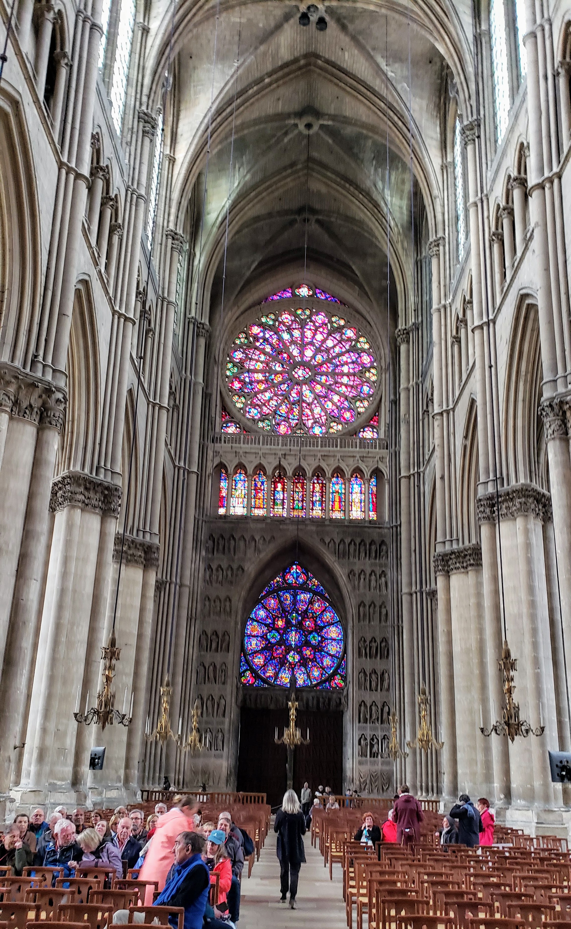 Next was a stop in Reims, France (pronounced “Rhas,” where “Rh” represents that unique, throaty, cough-like French “R” sound). We had some free time to explore the market square and find lunch before taking a brief walking tour with a local guide. The major attraction on the tour was the Cathedrale Notre-Dame de Rheims. The cathedral was originally founded in early 5th century and dedicated to the Virgin Mary (or “Our Lady,” thus “Notre-Dame”) and was the traditional site for coronation of French kings, at least before the French began cutting off their heads. Clovis was the first king baptized and crowned in the cathedral and is still entombed in the present-day church. Construction of the present church was begun in the 13th century, on the site of an earlier church destroyed by fire, and completed in the 14th century. It is a beautiful example of high gothic architecture, undergoing extensive restorations in the 19th century following minor damage during the French revolution and in the 20th century following major damage during World War I.