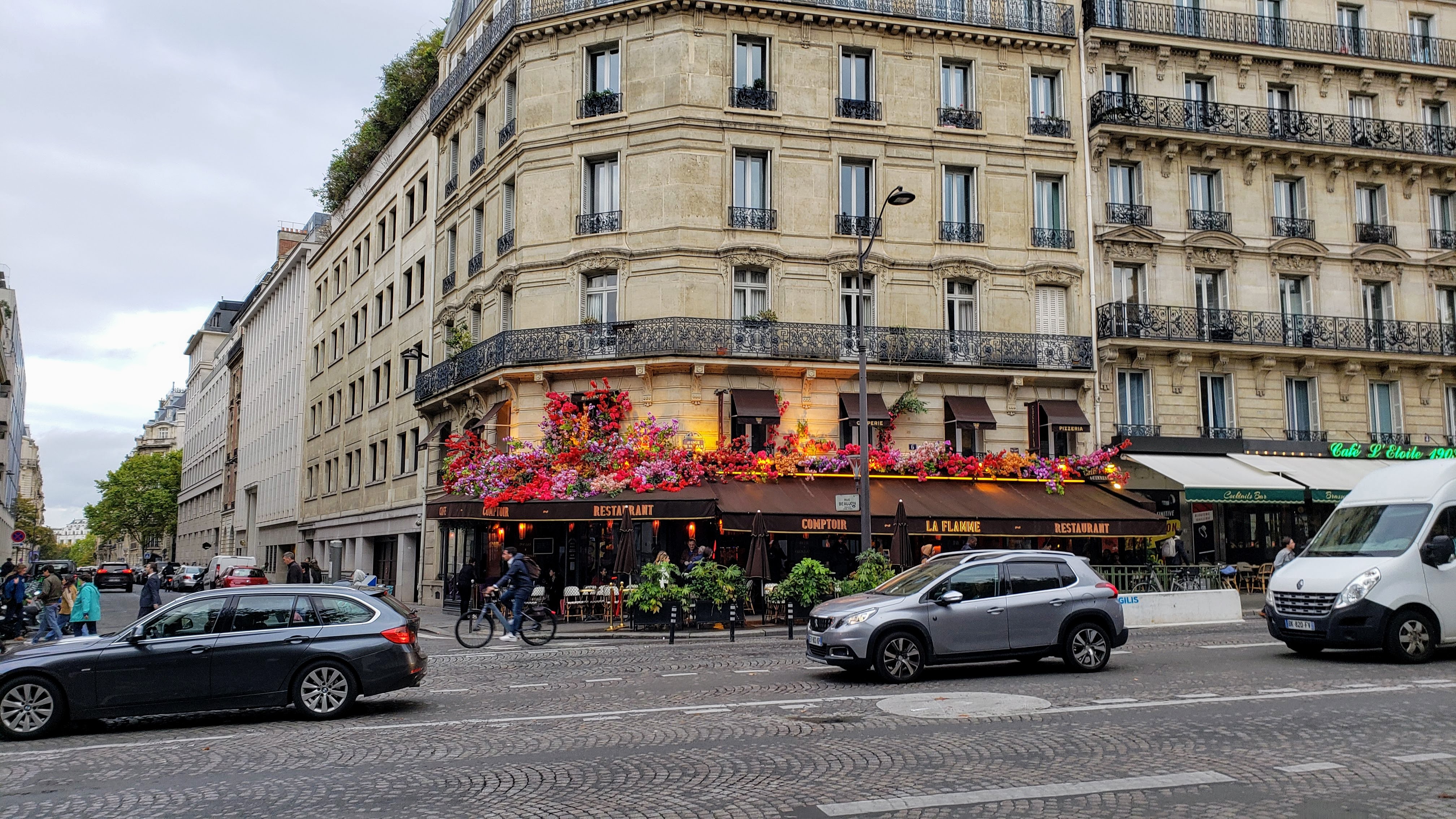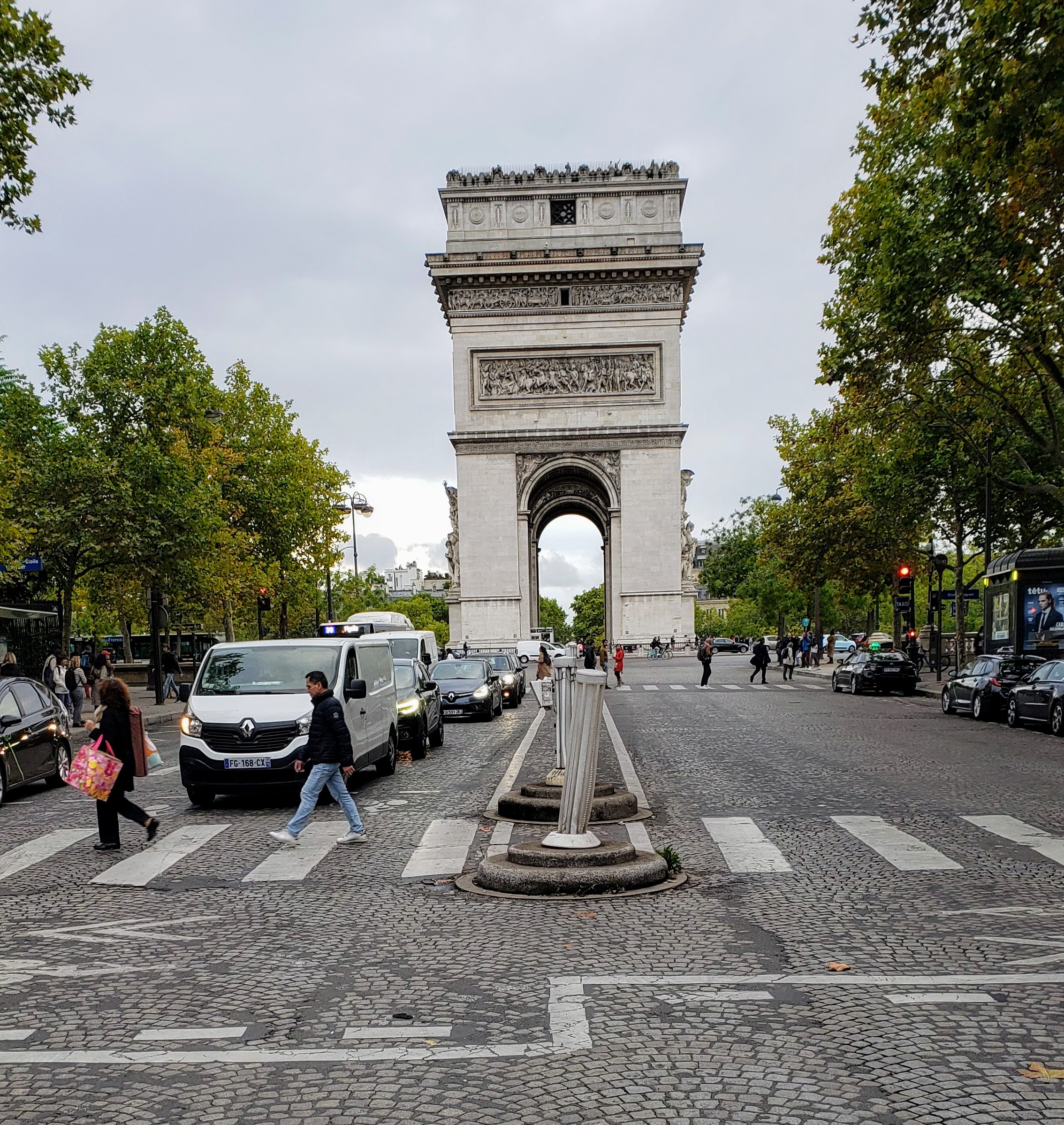 At any rate, once our luggage was delivered to the room, we set off on foot to explore the area around the hotel. We were quite impressed with the hustle and bustle of the city and the many fashionably dressed women – I suppose the men were also fashionably dressed but somehow, they didn’t make an impression on me. (Am I a chauvinist pig? Perhaps a bit …). Our walk took us to the Arc de Triomphe before we found a restaurant called La Flamme, where we had lovely Parisian dinner.