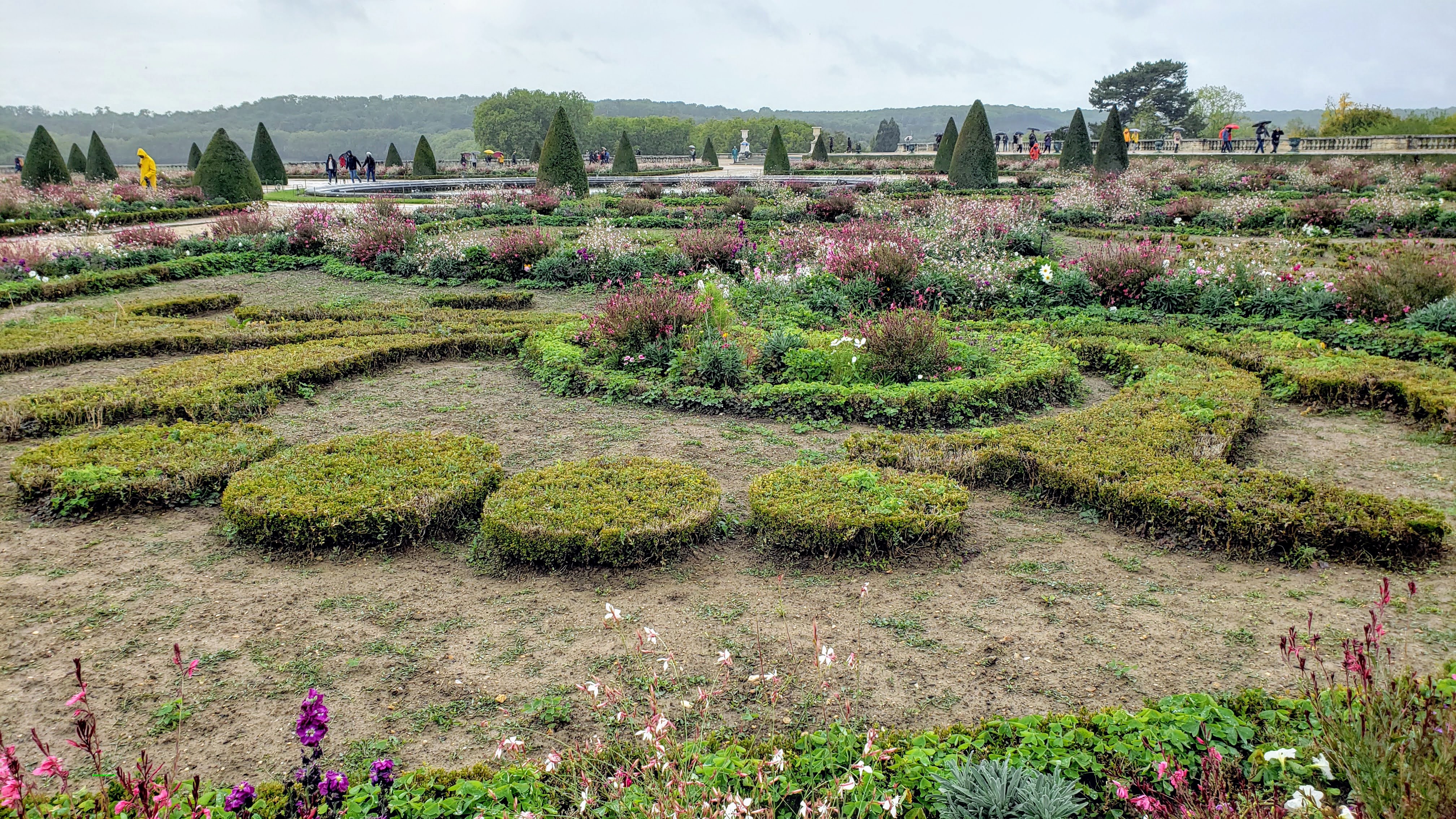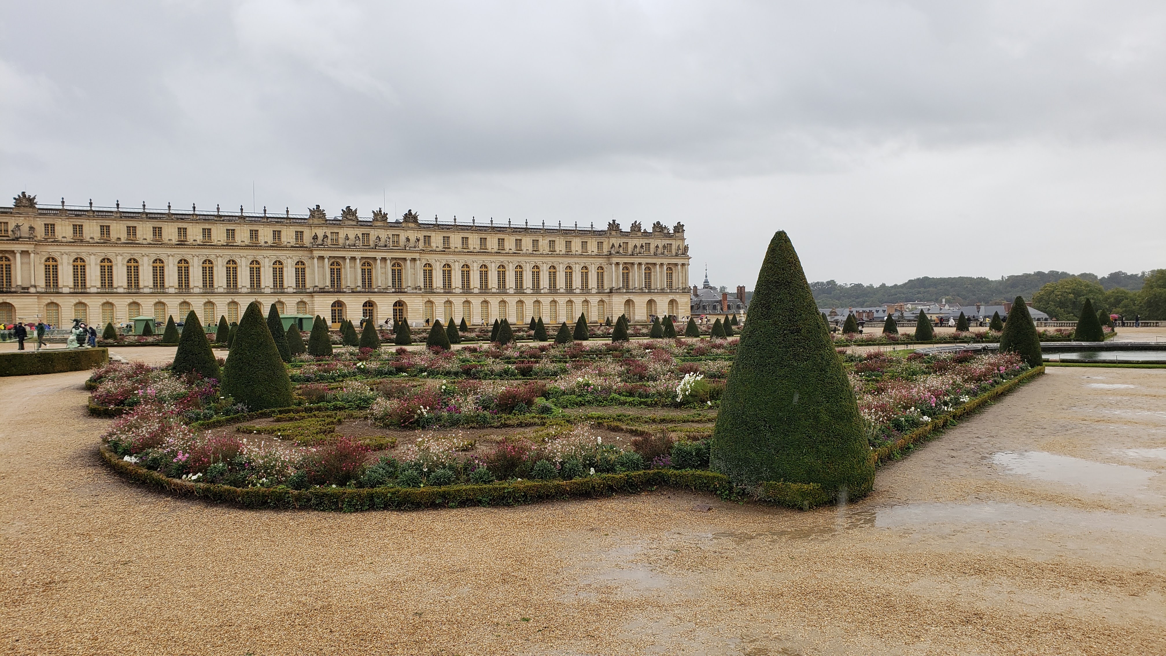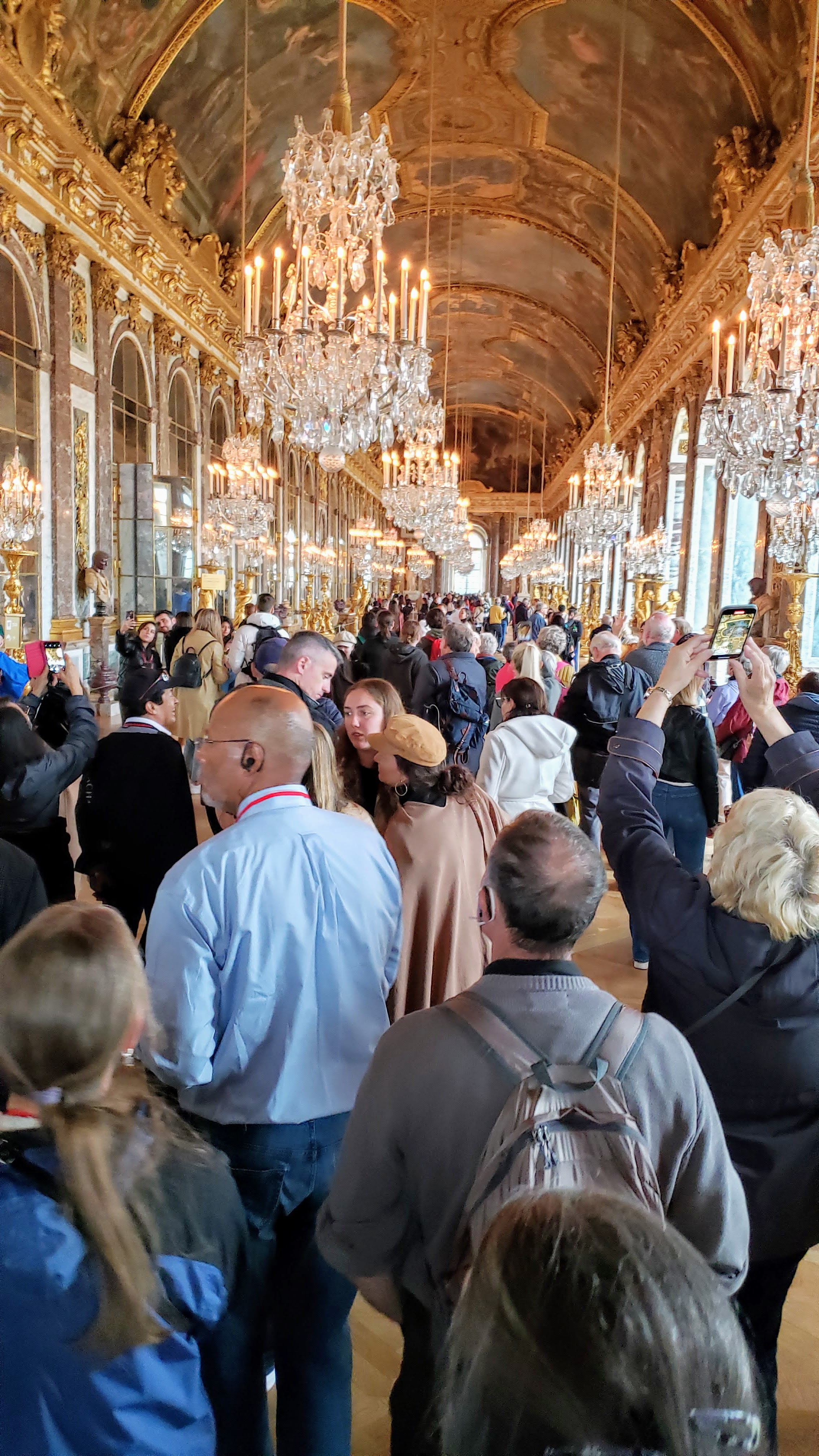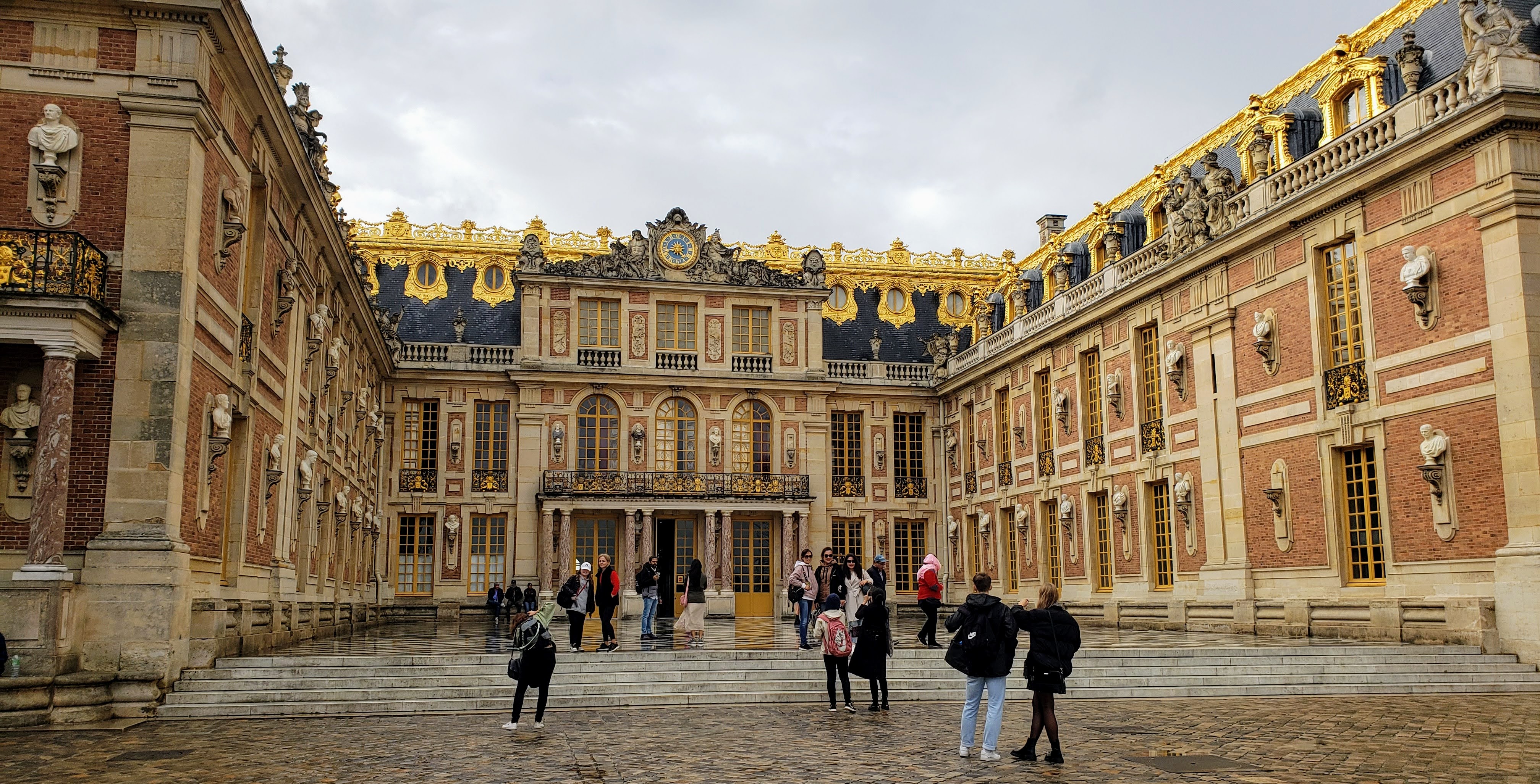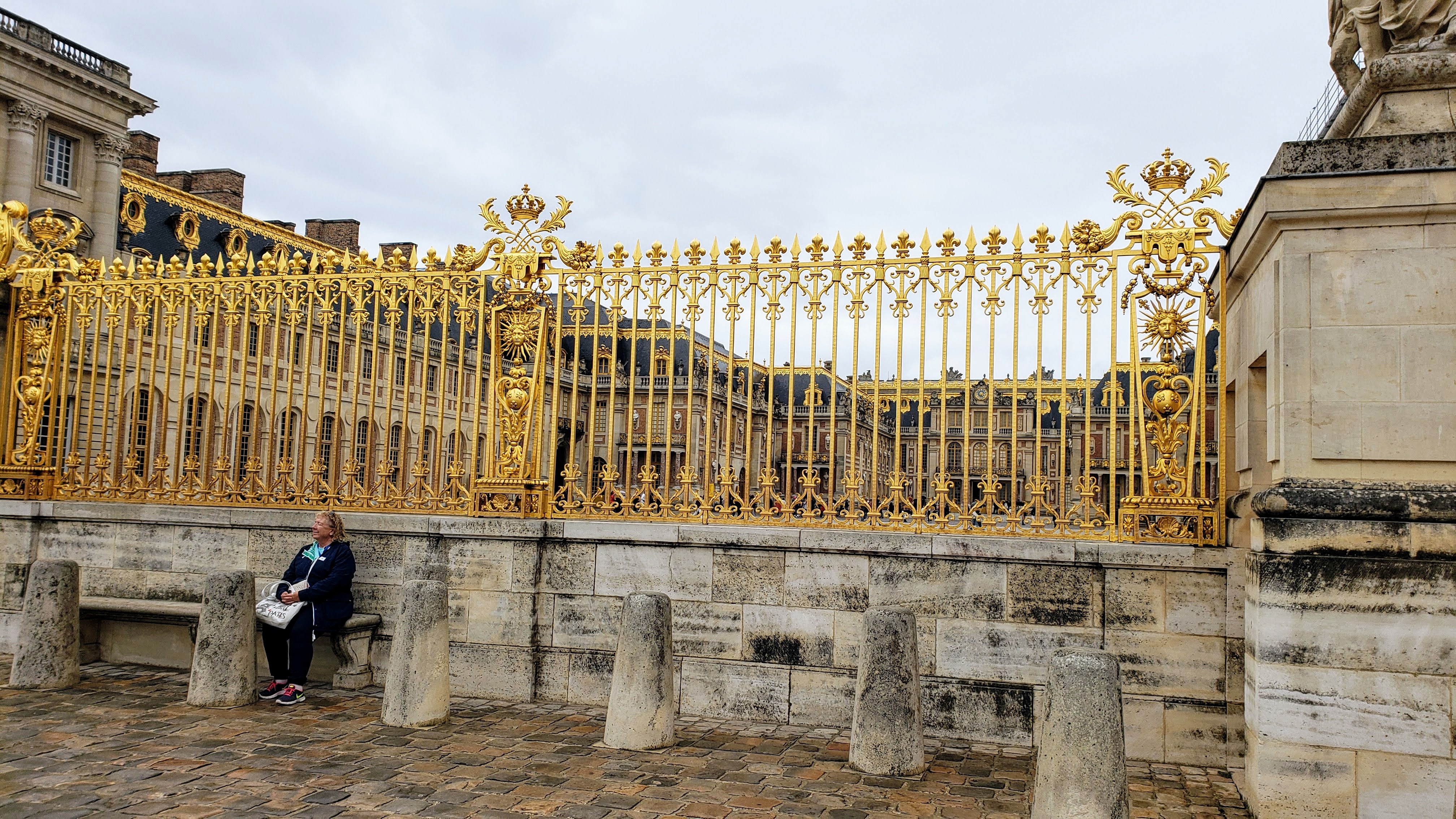 The bus returned us to the hotel shortly before 1 PM, and we walked to Le Pain du Faubourg to buy a nice sandwich for lunch. After devouring the sandwich back at the hotel, we once again headed out to board a bus at 2 PM, this time for a tour of the famous Palace of Versailles. The bus ride took a half hour as we drove 11 miles to the southwest, passing directly by the Roland-Garros Tennis Center. This caused a brief pang of regret for Pat, as we had originally planned to take this Viking trip in May of 2020, at which time the French Open tennis tournament would be ongoing and she might have been able to attend some matches. Of course, not only was the Viking trip cancelled due to Covid but the French Open was also delayed for five months, but we have vowed to return some year during a future French Open.