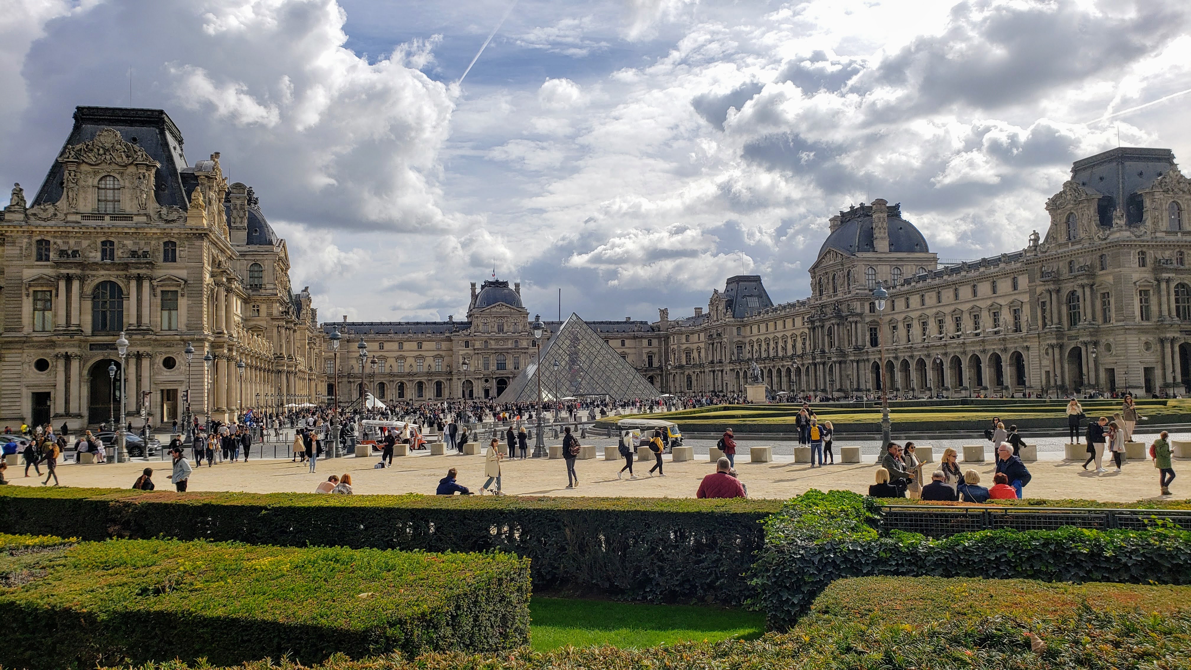 Sep 27 (Tuesday): After a complimentary buffet breakfast at the hotel, we boarded a bus for an introductory tour of Paris. Shortly after departing, we noticed a nice-looking Boulangerie called Le Pain du Faubourg and made note of it as a potential place for lunch. The bus then made a circuit around the rather amazing traffic circle surrounding the Arc de Triomphe – it has some seven or eight lanes of traffic, all unmarked, and connects to a dozen avenues which radiate out like bicycle spokes. Somehow the Paris drivers manage to safely negotiate it while weaving across multiple lanes to reach their desired avenues, but we were extremely happy to be riding the bus rather than trying to drive on our own. The bus tour took us to the central city and along the right bank of the Seine River (after very briefly crossing to the left bank and back again) while our guide pointed out various landmarks. Most notable to me was the Louvre, the former royal palace which now houses the word-renowned art gallery. I could not believe the size of it – it was simply impossible to capture it in a photo.