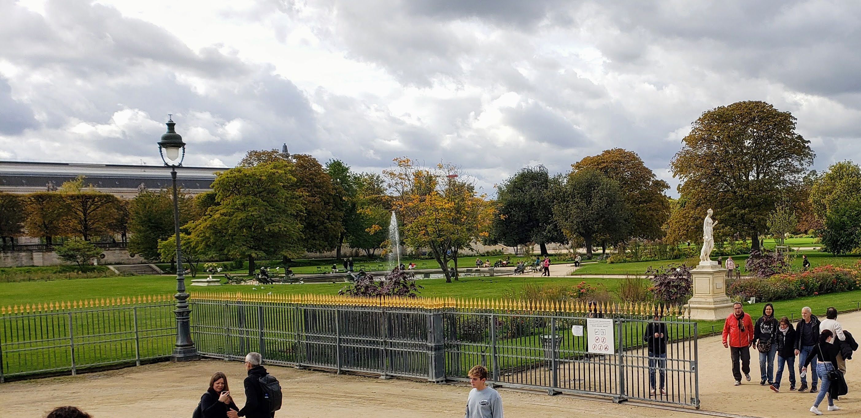 As we walked down the Montmartre hill, I was again approached by a supposedly deaf person soliciting money, and she became rather aggressive when I failed to produce any money. She eventually walked away and I saw that she joined a group of about a dozen women of similar age, all wearing what was essentially a uniform of a gray jumper over a white blouse. Harrumph again. We then walked to a restaurant recommended by a search on Pat’s phone, but it required reservations. Luckily, we found a nice, casual place called the Brasserie Flotte nearby. After lunch we set off for the Louvre, not actually to visit the museum, but to see the famous pyramid at the entrance and to explore the nearby Tuileries Garden.