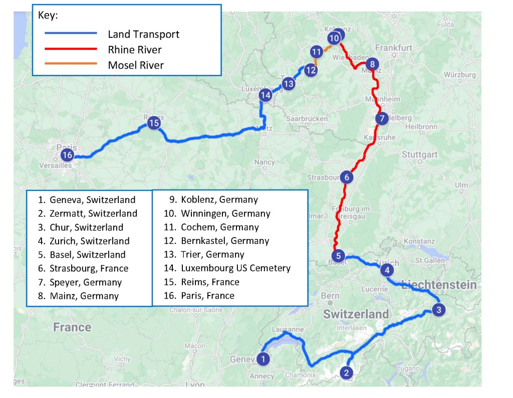 So, there you have it, dear readers – all in all an amazing and thoroughly enjoyable journey. Here’s a map of our travels through Switzerland, down the Rhine, up the Mosel, and on to Paris.