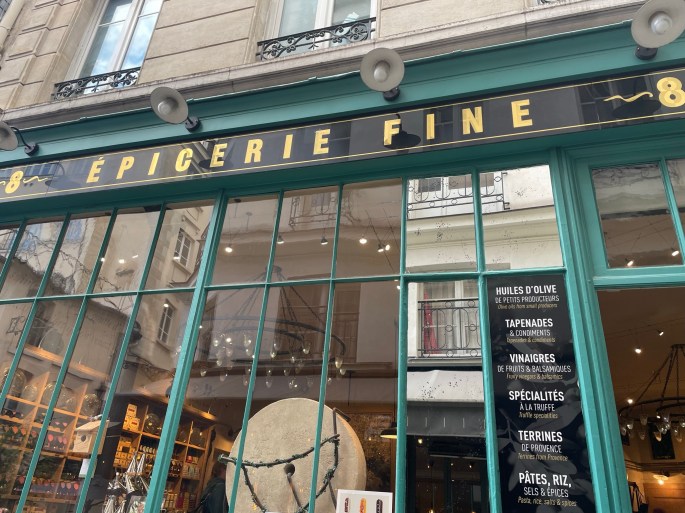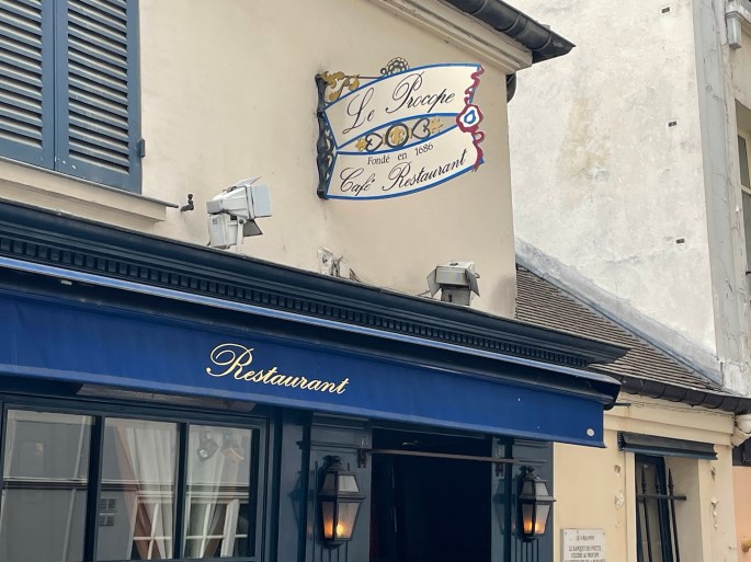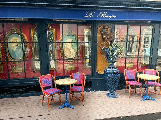 She then went off to get another sandwich at Le Pain du Faubourg, but she returned with a surprise for me. Somehow, she took a wrong turn or something and couldn’t find the place, but she found a similar place whose name she doesn’t recall and bought a sandwich there. And, wonder of wonders, the place had cans of Dr. Pepper! She bought two for me, and my previously flagging spirits soared! Then she was off again, this time for a walking tour called “Flavors of Paris” to the St. Germaine neighborhood in the 6th Arrondissement. She visited four local shops and sampled Parisian foods, including olive oil, chocolate, cheeses, and macaroons. She also passed by the oldest café in Paris, Le Procop.