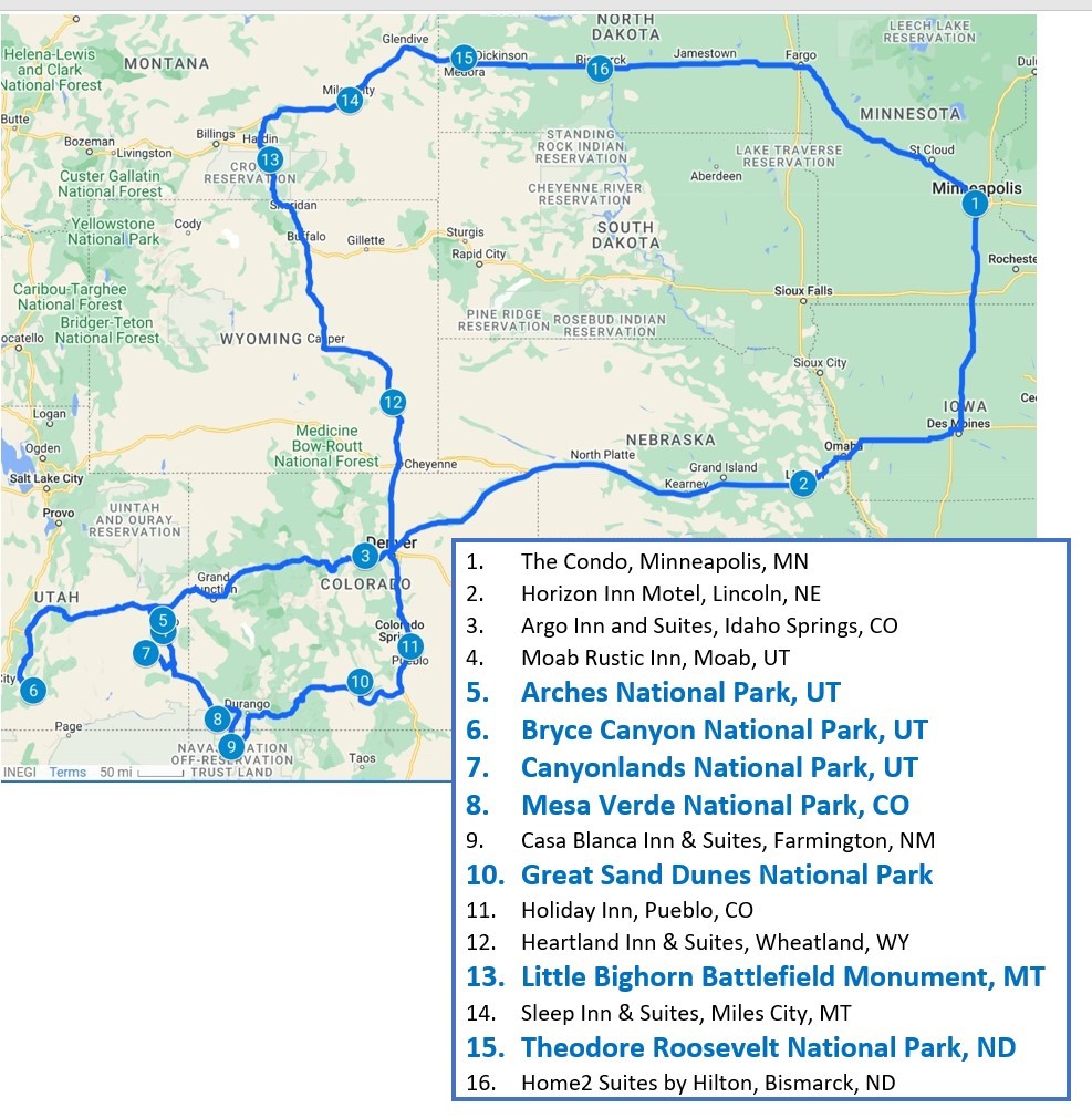 In Part 1 of this travel blog, I began the description of our recent 4,128-mile road trip, during which we visited six National Parks and one National Battlefield. As a reminder, here’s a map of the journey: