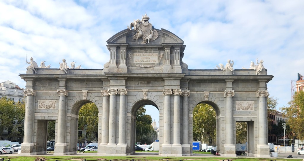 Madrid and Toledo (November 7-9): On Thursday the 7th, Pat and I were met at the Madrid Airport by a Viking driver, who drove us and our luggage to the Hyatt Regency Hesperia Hotel in the Paseo de la Castellana neighborhood of Madrid. There we met our Madrid Viking Host, Susana, who explained that we were the first of a dozen Viking tourists to arrive for this pre-cruise extension and provided us with a map of the area and suggestions for exploring on our own before meeting with the entire group later that evening. Thus armed, we trundled off to wander the streets of Madrid, observing many interesting buildings and sculptures. I confidently led us off in the wrong direction, but after Pat activated the Google maps app, we made our way to the Retiro Park, established in the mid-17th century for the enjoyment of King Philip IV. The nearby Puerta de Alcala, erected in 1778 by Italian architect Francesco Sabatini, is a triumphal gate that was once the main entrance to the city. It was commissioned by King Charles III (later nicknamed the Best Mayor of Madrid), who was unimpressed by the gate that welcomed him when he first arrived in 1759.
