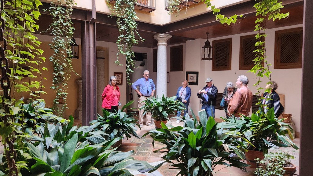 Toledo is known as the “City of the Three Cultures” for the cultural influences of Moors, Christians, and Jews throughout its history. Toledo has long been known for its production of fine steel for weapons and jewelry, so we first visited a touristy factory/retail outlet just outside the town and saw how some of the products are made today. We then traveled into the city and rode to the top of the hill on a series of conveniently located escalators before beginning our walking tour. While the streets of the old city are very narrow, many houses have beautiful courtyards just inside their doors.