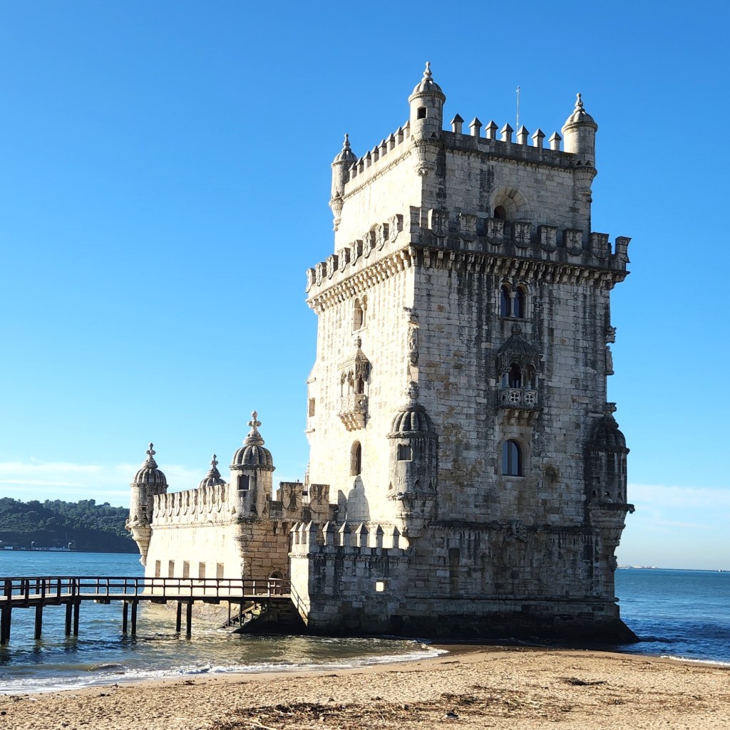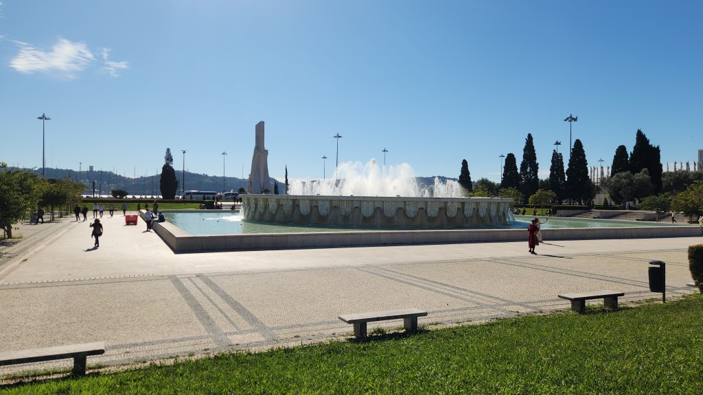 On Monday the 11th, we headed off on a bus and walking tour of Lisbon, during which we took in the sights and learned quite a bit of Portuguese history. (Now known as a well-functioning democracy, Portugal was actually ruled by a dictator, António de Oliveira Salazar, from 1932 until he died in 1970. His successor was deposed in the bloodless Carnation Revolution in 1974, and Portugal transitioned to a constitutional democracy by 1976). We drove through the hilly city to the tourist area called Belém near the Tagus River – the very same river we saw in Toledo, by this point grown very wide before discharging into the Atlantic – where we saw the Belém Tower, a 16th-century fortification that served as a point of embarkation and disembarkation for Portuguese explorers and as a ceremonial gateway to Lisbon. It was built during the height of the Portuguese Renaissance, and is a prominent example of the Portuguese Manueline style, but it also incorporates other architectural styles, such as the minarets inspired by Moorish architecture.