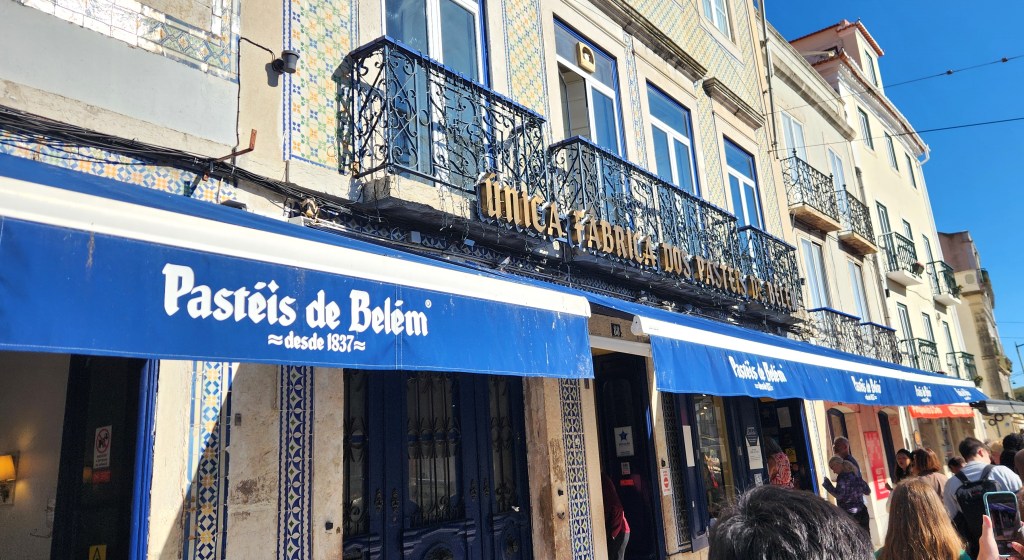 Following the museum visit, we had free time to visit the Jeronimos Monastery, erected in the early 1500s near the launch point of Vasco da Gama’s first journey, and nearby shops, including the Pastéis de Belem bakery, established in 1837 to make the original, world famous Pastéis de Belém from an ancient recipe developed by the monks of St. Jerome at the monastery. The recipe remains secret, and these delicious custard pastries are made every day “by hand,” supposedly using traditional methods. Amazingly, they produce and sell 20-40,000 of them per day. Pat and I each had one, and they more than lived up to their reputation. We explored the nearby Vasco da Gama Garden while savoring them, before returning to the tour bus.