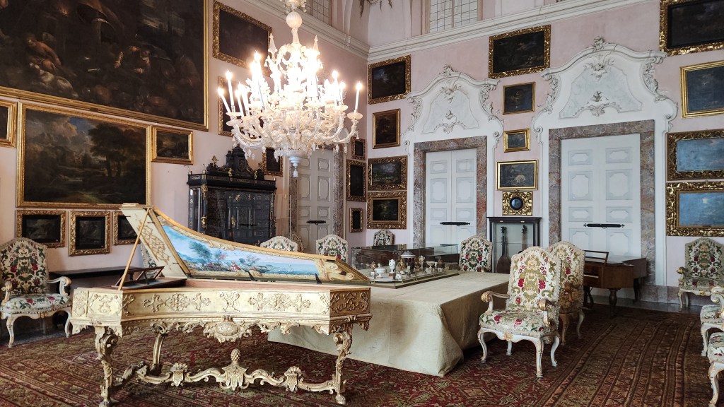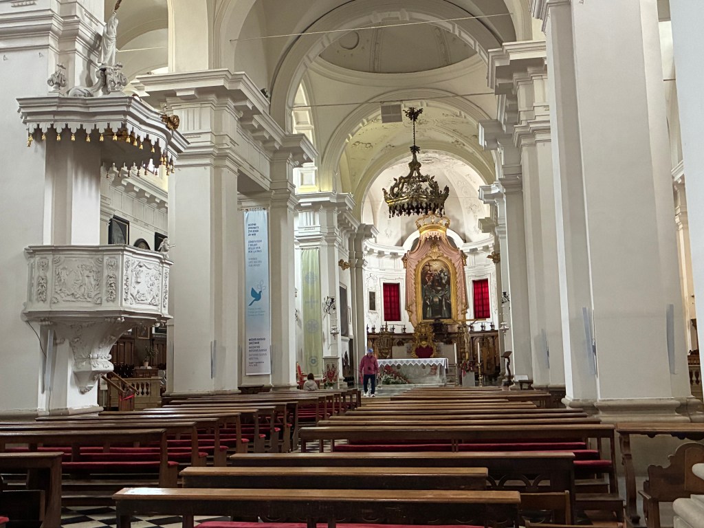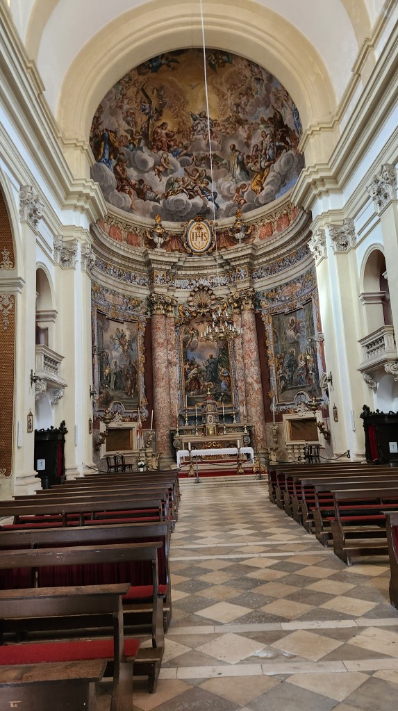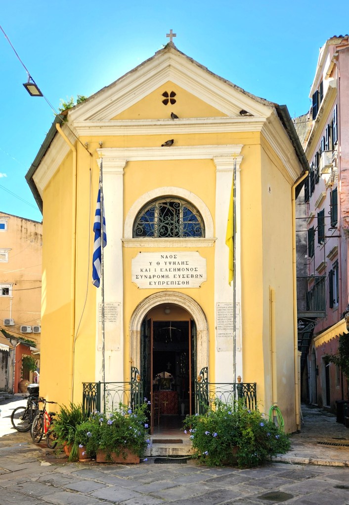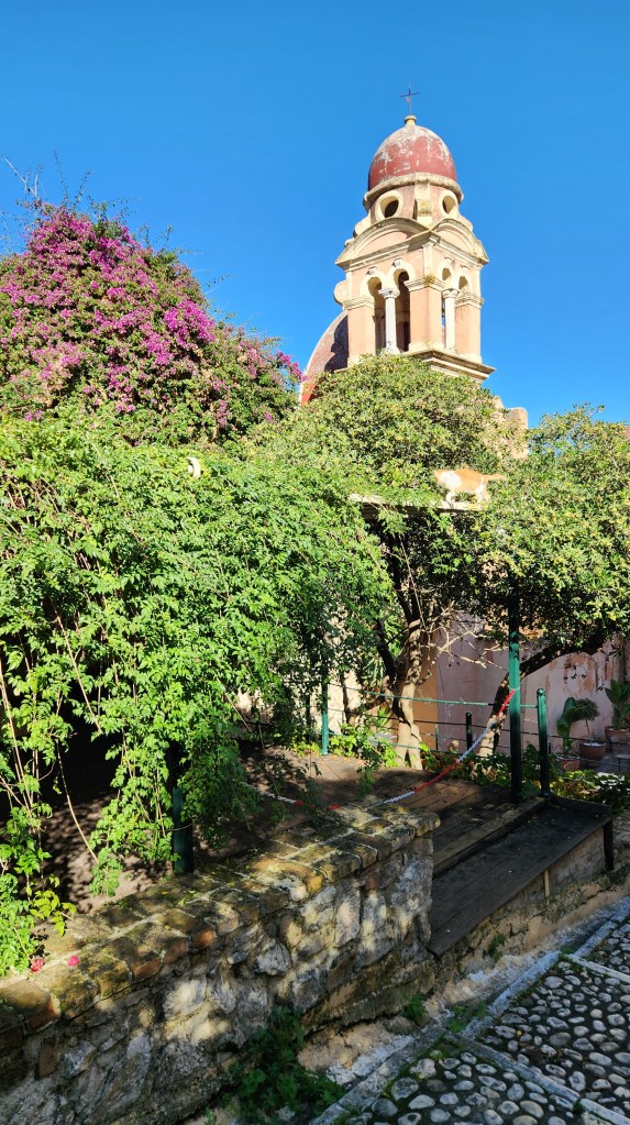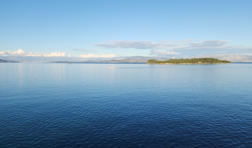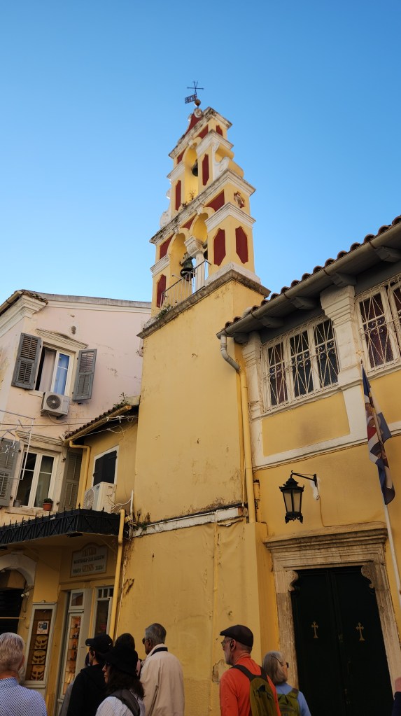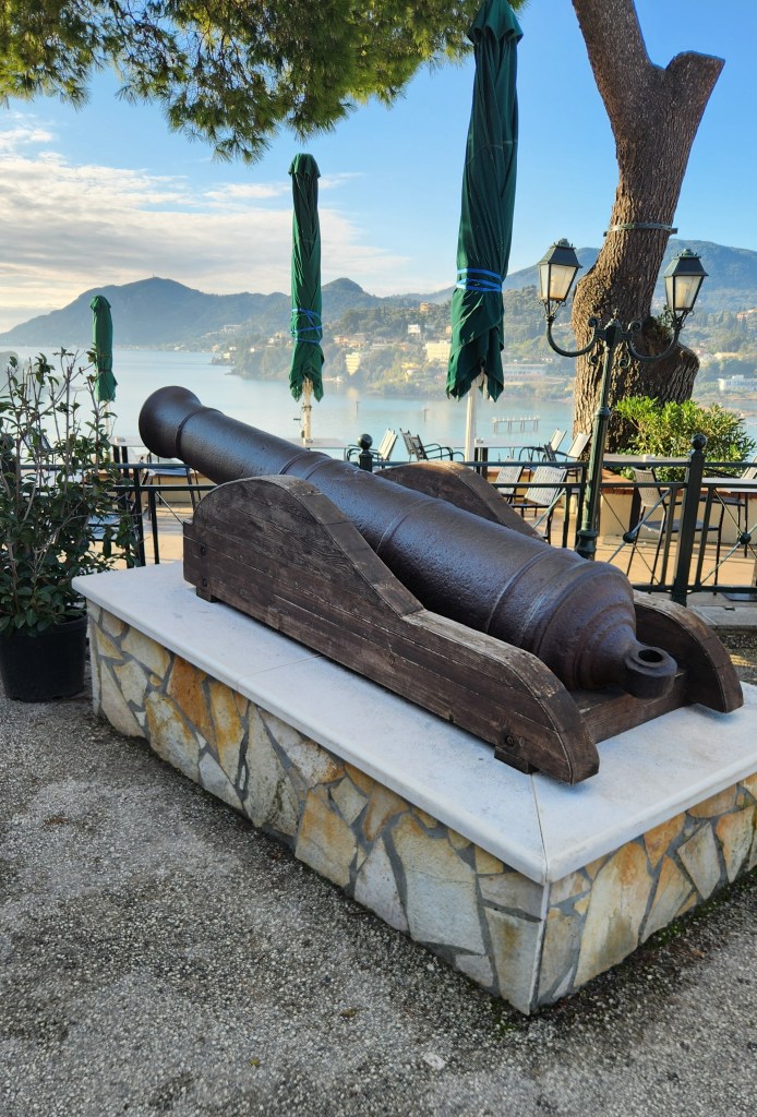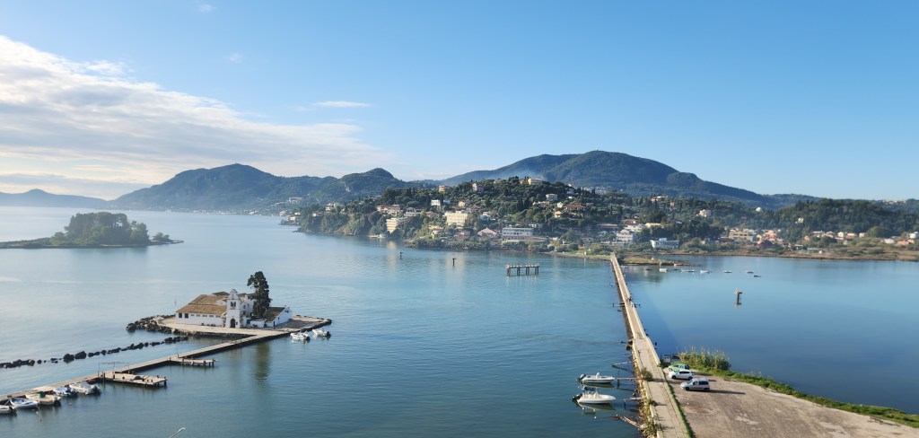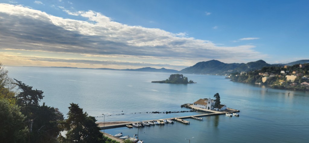 Our shore excursion began with a bus trip through the countryside to the Kanoni viewpoint, a popular lookout spot high above the harbor of Corfu Town named for the old cannon facing the sea. From there, we had beautiful views of the Straits of Corfu and the Greek mainland in the distance. The most famous island near Corfu town is called Mouse Island, supposedly for its mouse-like shape; the island is famous for its Byzantine church and connection to the Odyssey legend. Closer to shore sits the 17th century Vlacherna Monastery, situated nearby on a separate islet connected to the mainland by a causeway.