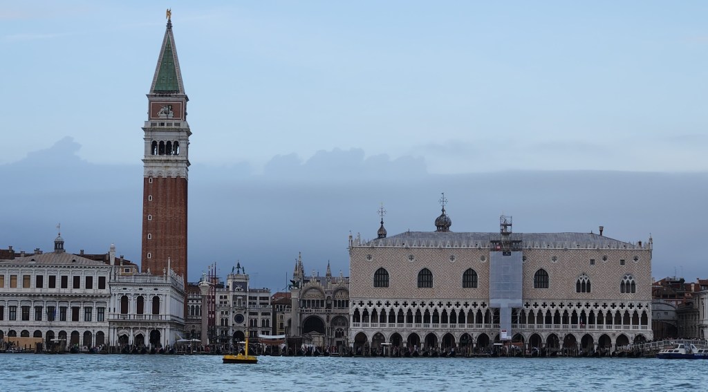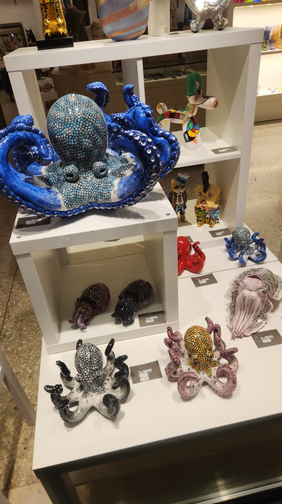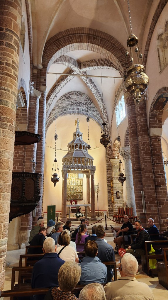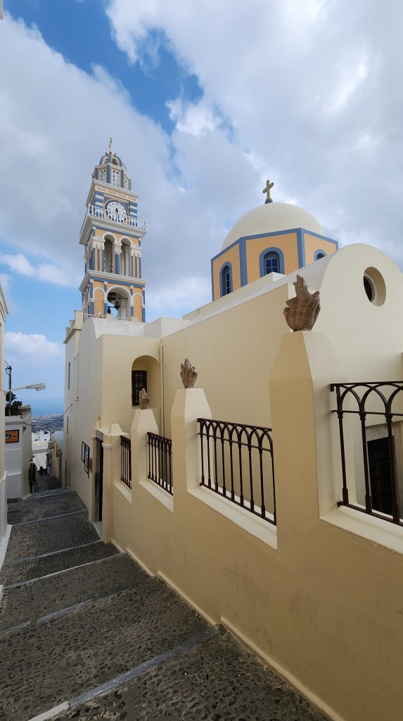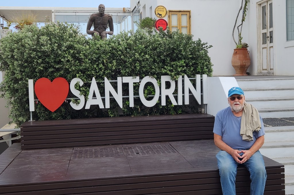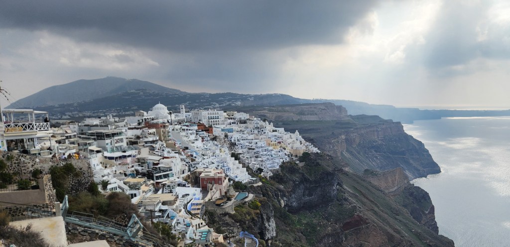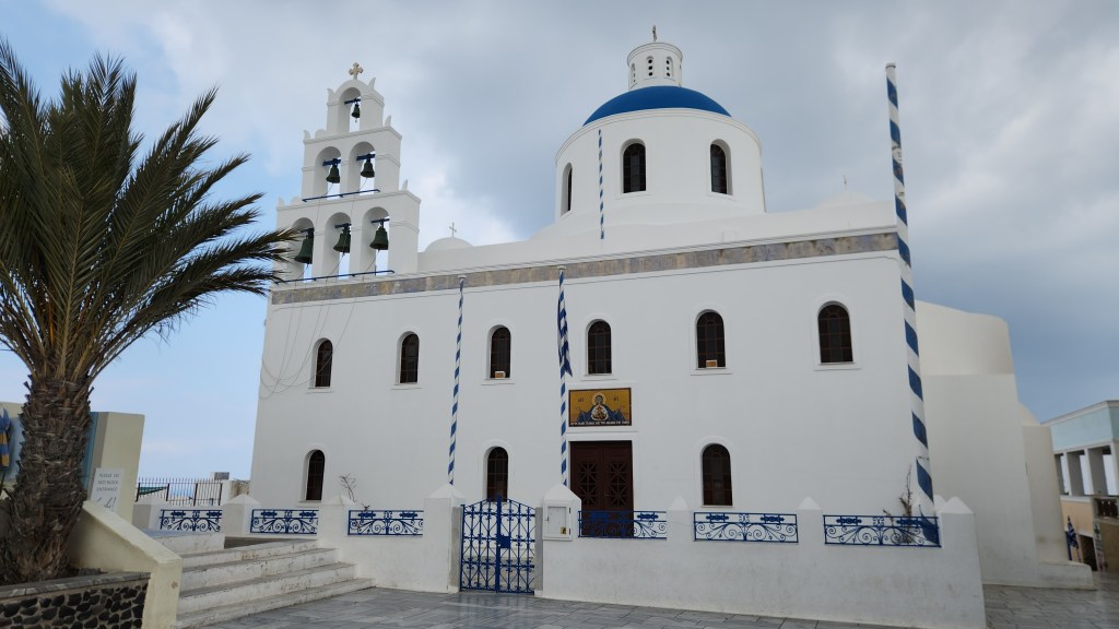 For our shore excursion, we boarded a tender boat operated by the local Greek authorities, which deposited us on shore. We then boarded a bus for a zig-zagging trip up the steep slope to the rim of the caldera and the capital city of Fira and then on to the village of Oia (pronounced “ee-ya”). In Oia, we had a brief walking tour before heading off for exploration on our own and lunch at a nice café, where we had lamb and Moussaka accompanied by an excellent Santorini wine. The village is known for its beautiful vistas, cliffside whitewashed buildings, blue-domed churches, and stunning sunsets over the caldera. (Unfortunately, the overcast skies hampered the views and we had to leave before dark so did not see the sunset. Such is life …)