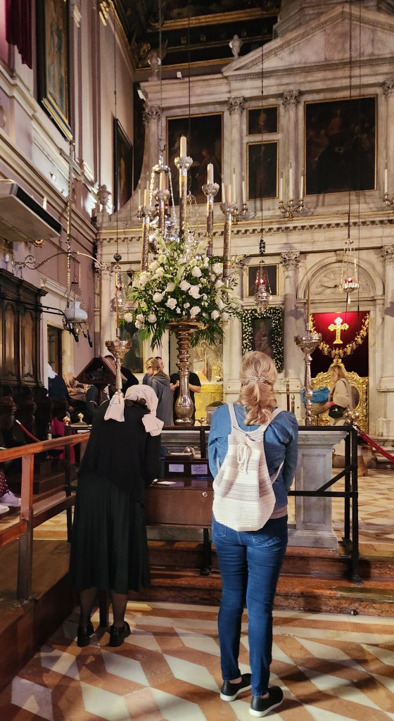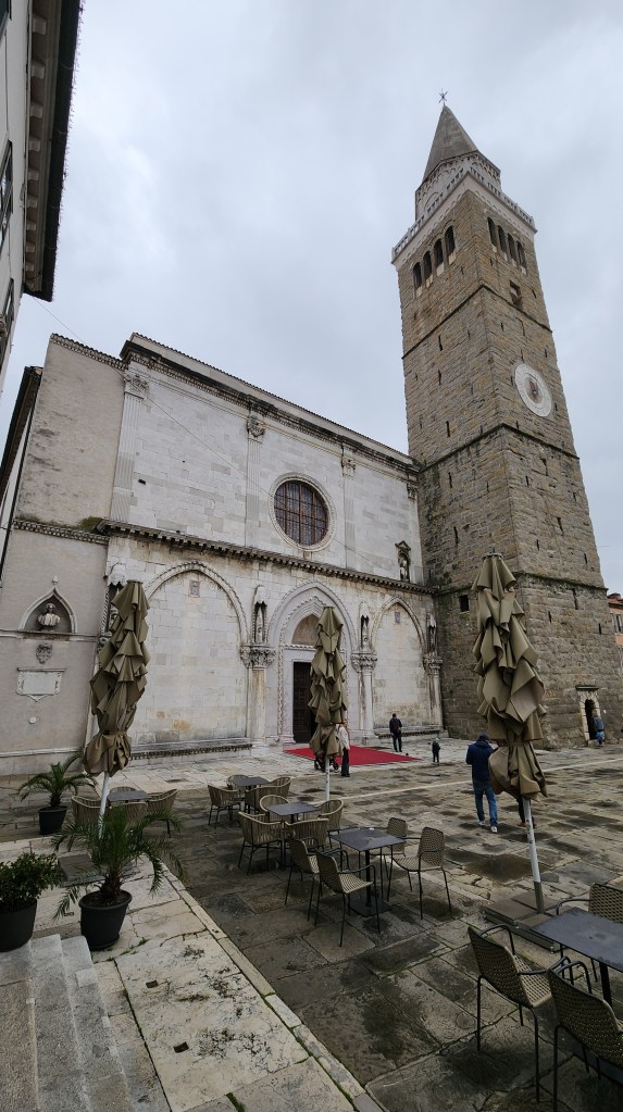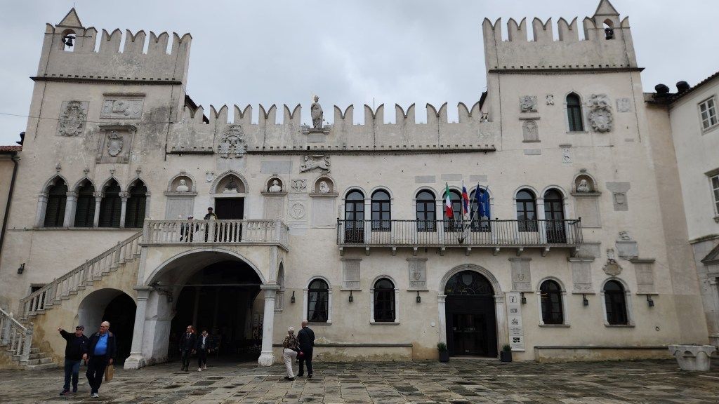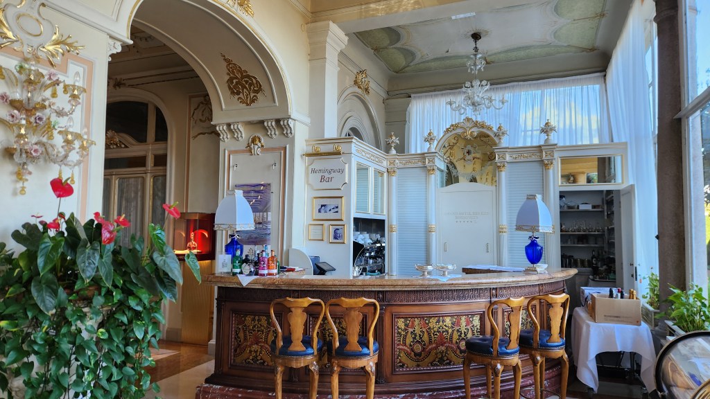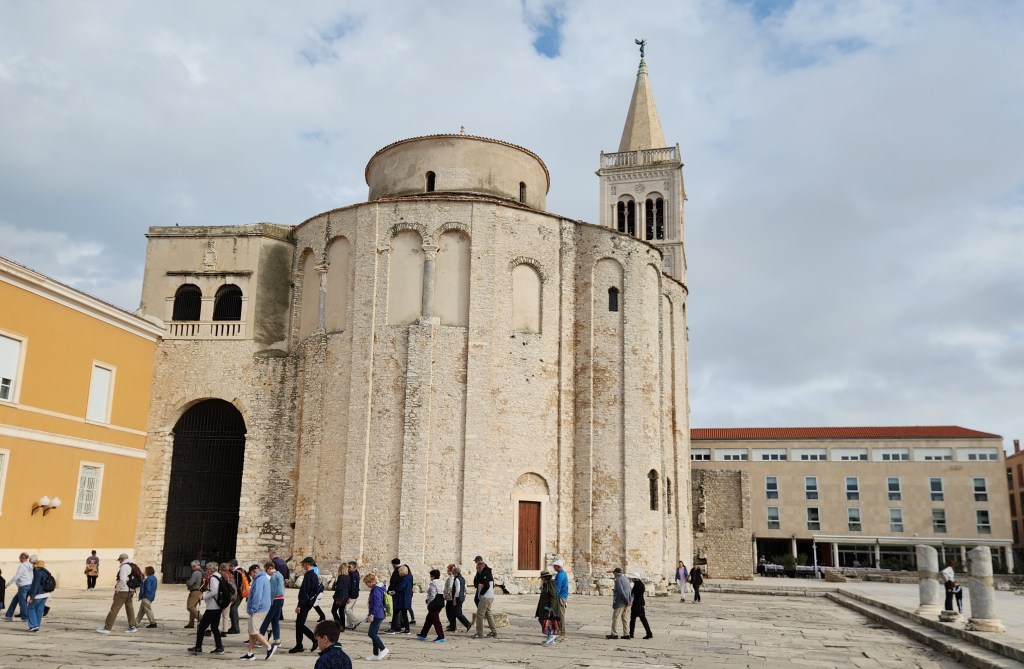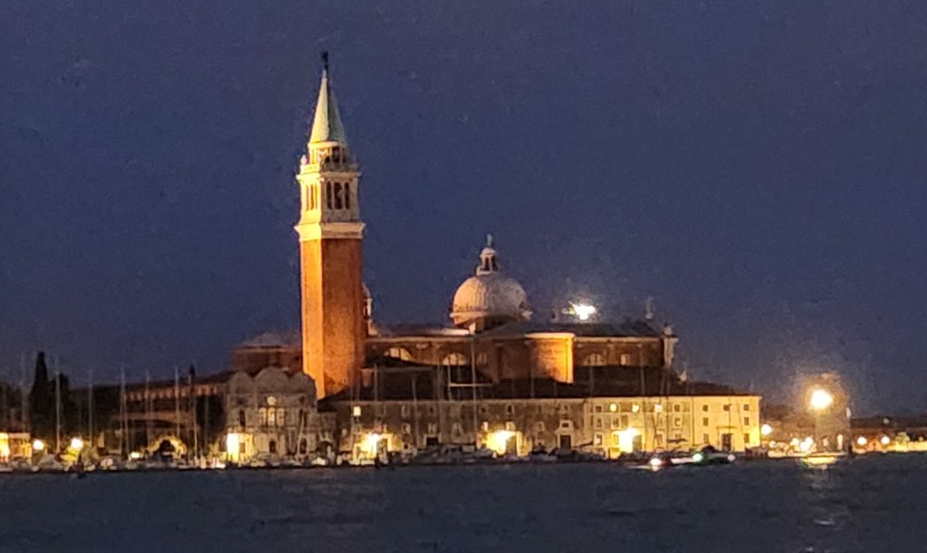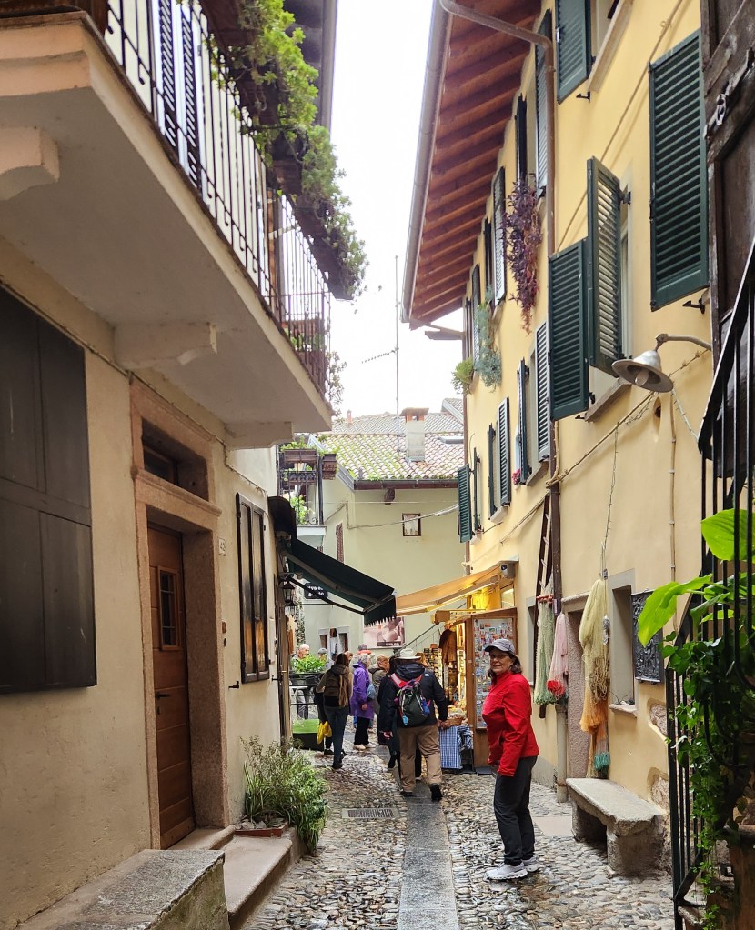 For our shore excursion, we boarded a tender boat operated by the local Greek authorities, which deposited us on shore. We then boarded a bus for a zig-zagging trip up the steep slope to the rim of the caldera and the capital city of Fira and then on to the village of Oia (pronounced “ee-ya”). In Oia, we had a brief walking tour before heading off for exploration on our own and lunch at a nice café, where we had lamb and Moussaka accompanied by an excellent Santorini wine. The village is known for its beautiful vistas, cliffside whitewashed buildings, blue-domed churches, and stunning sunsets over the caldera. (Unfortunately, the overcast skies hampered the views and we had to leave before dark so did not see the sunset. Such is life …)