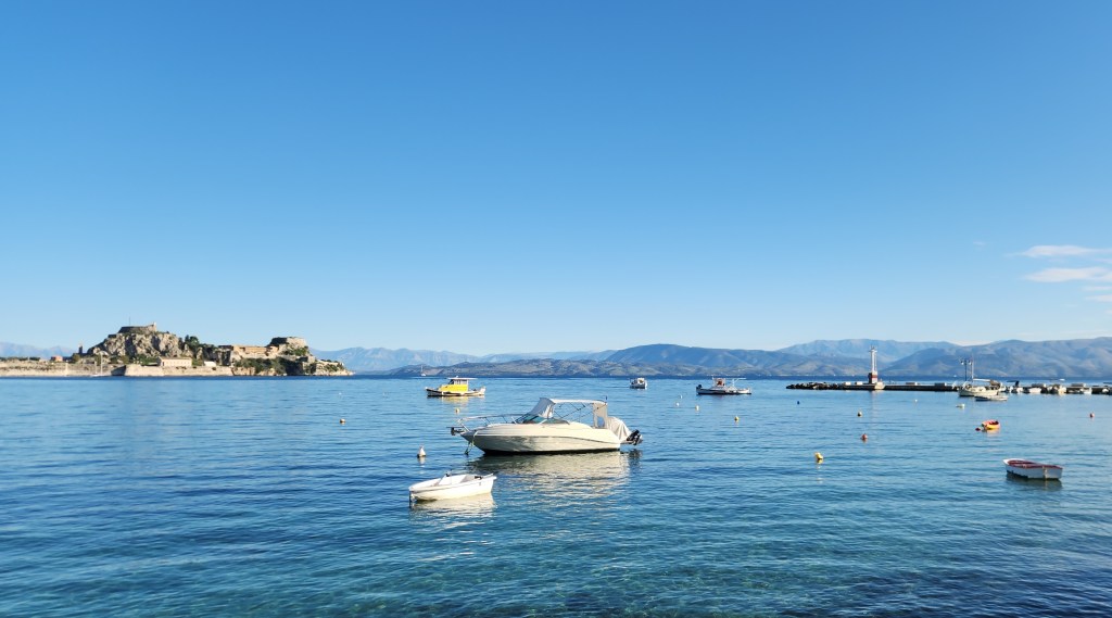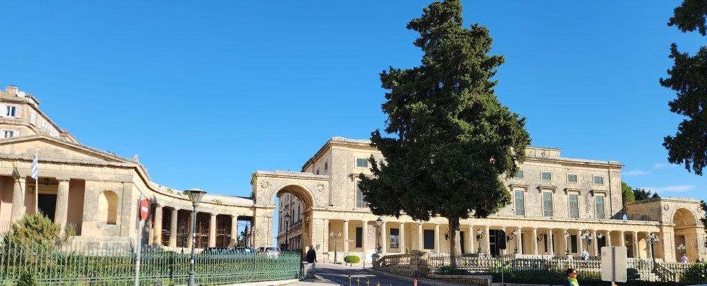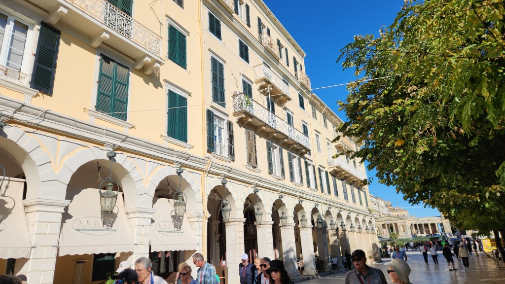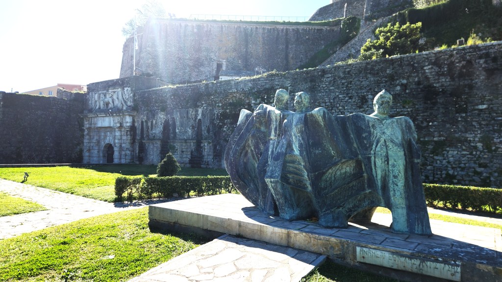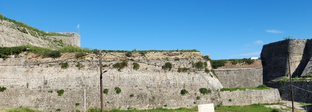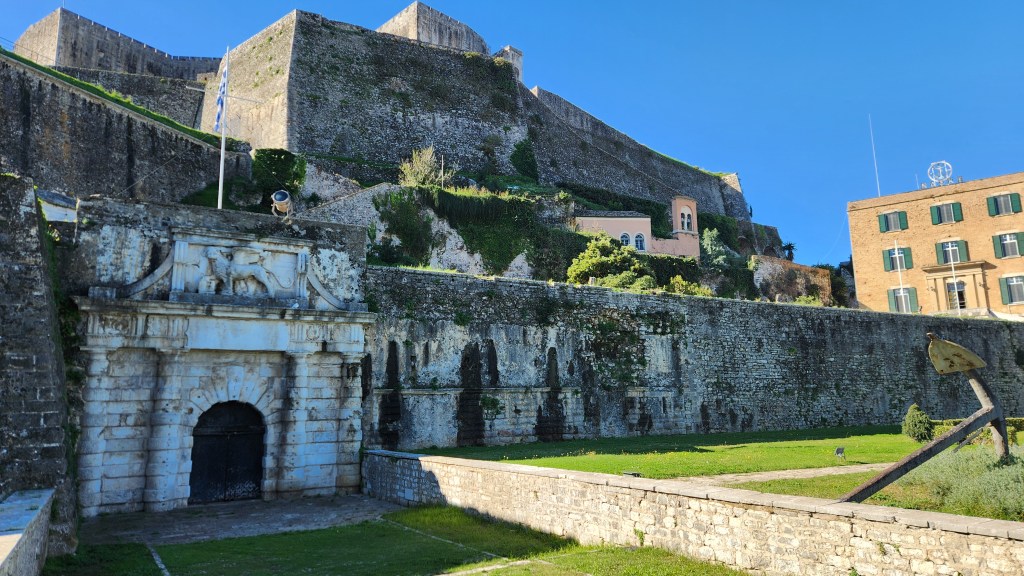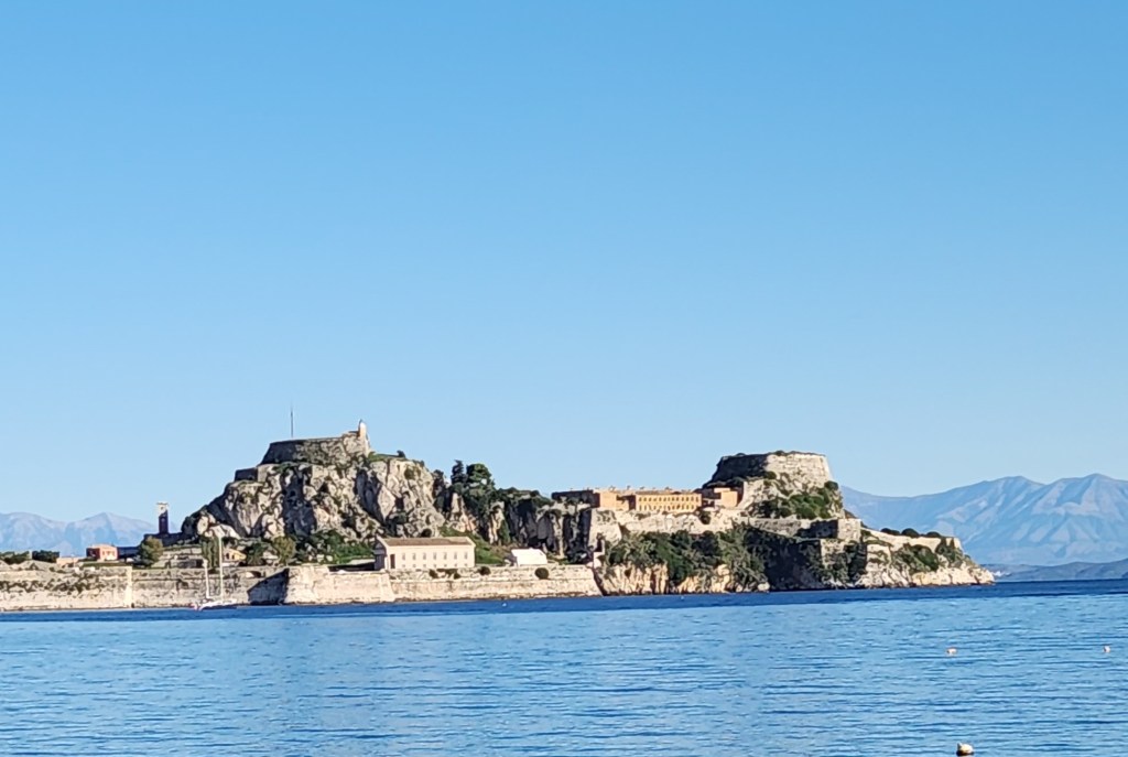 The bus then delivered us to the Corfu Town marina. Across the water we could see the Old Fortress, built by the Venetians in the 15th century on a site originally fortified by the Byzantines in the 12th century. The fortress was isolated from the mainland by a large moat and was used for successful defense of the city during multiple sieges by the Ottomans in the 16th century. The fortress has two towers, or peaks, which gave rise to the name of the Island – the Byzantine Greek word “Koryfó,” meaning “city of the peaks,” refers to the two peaks of the old fortress.