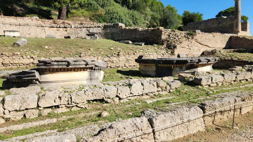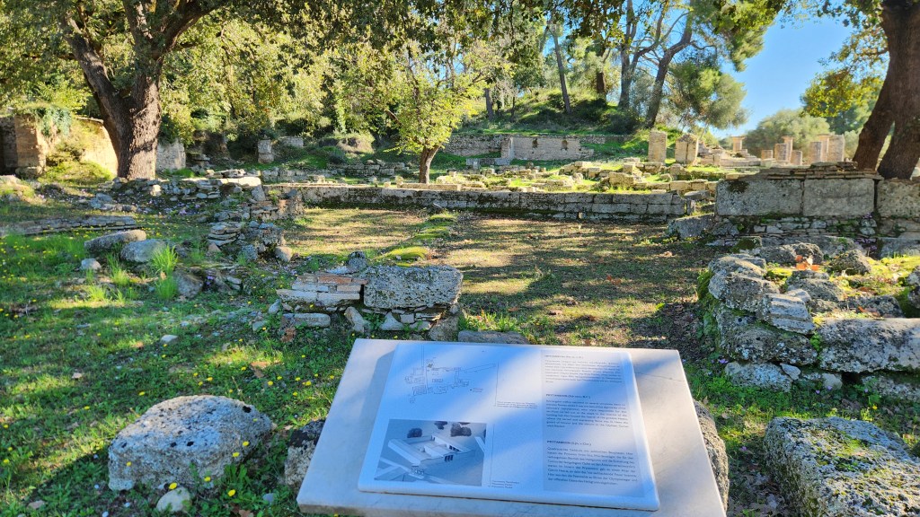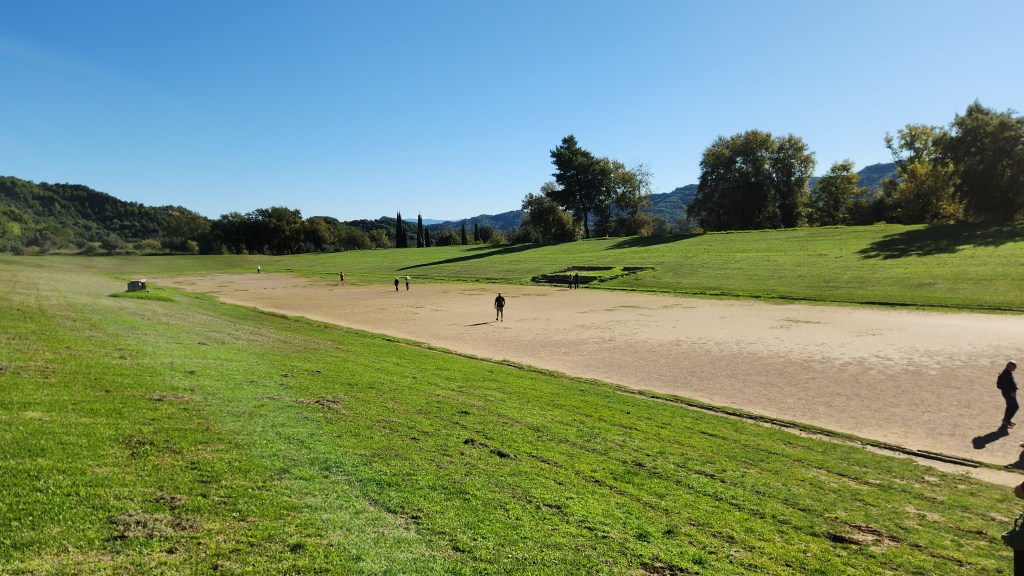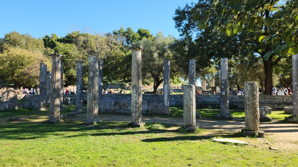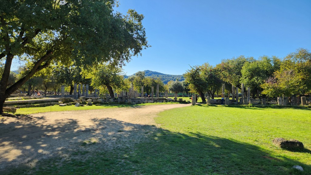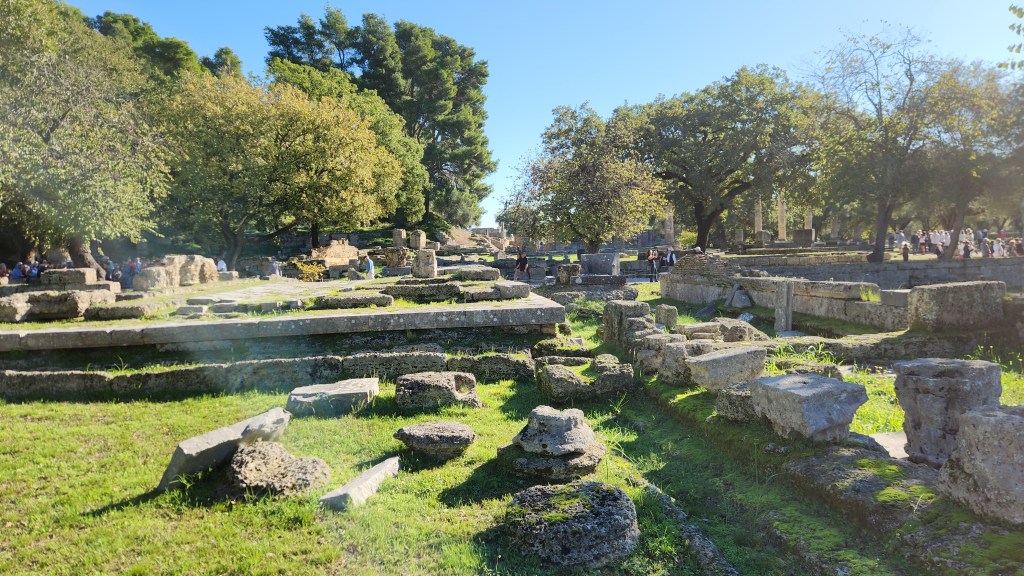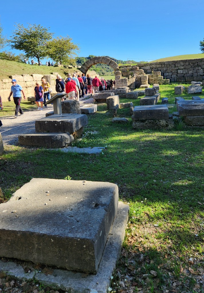 From the port, we departed for a 20-mile, 40-minute bus ride to the ancient site of Olympia, where the original Olympic Games were held every four years from 776 BCE until they were abolished in 393 AD by the Roman Emperor Theodosius I, who banned pagan festivals like the Olympics as part of his efforts to suppress paganism and promote Christianity.