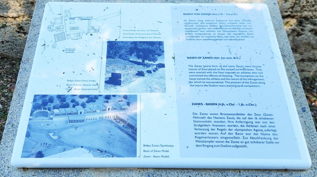 The path to the stadium is lined with bronze statues known as Zanes, which were paid for by athletes who cheated during the games. Known as the walk of shame, the walls feature inscriptions by the miscreants including their names and the misdeeds for which they were being punished, such as bribery, lying about their city-state, or other acts against the integrity of the games. The display was a reminder to all athletes entering the stadium of the importance of honesty and integrity.