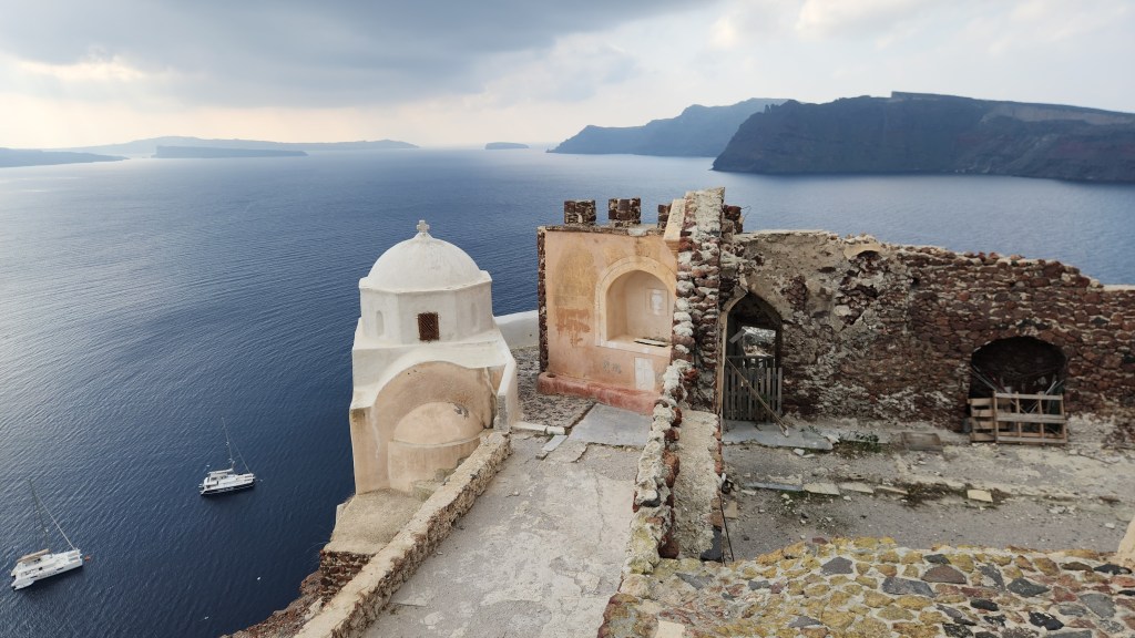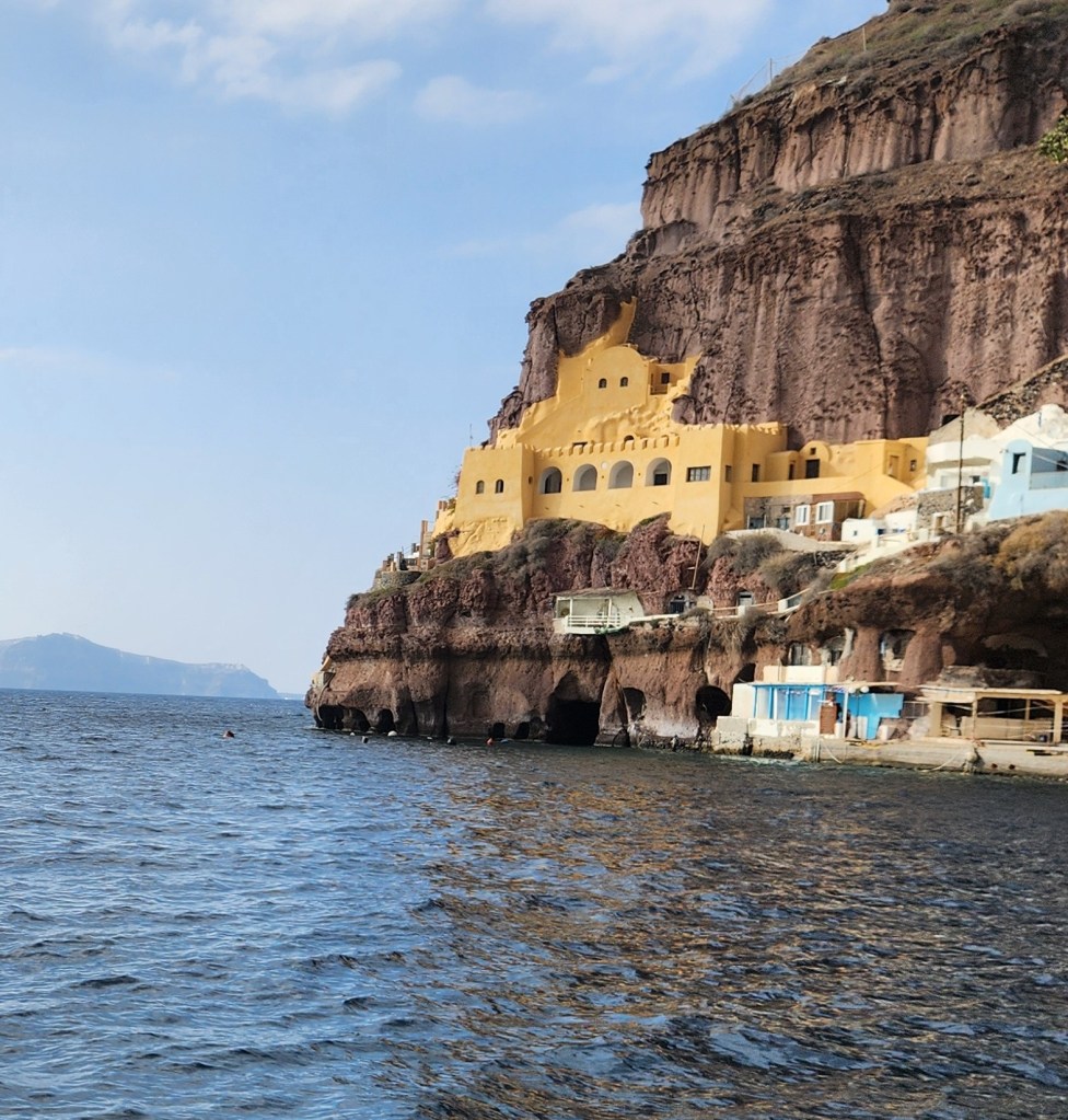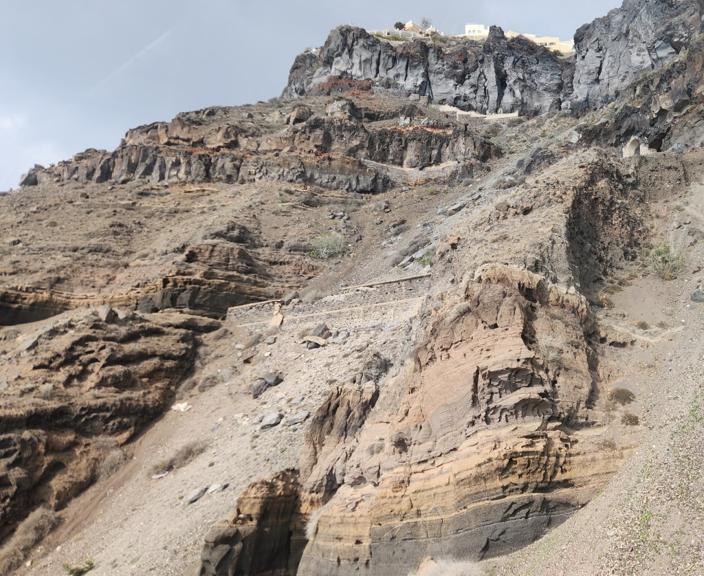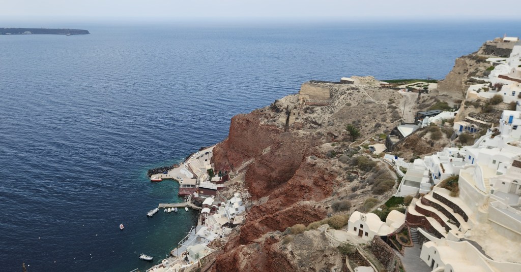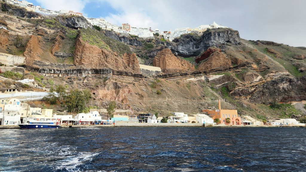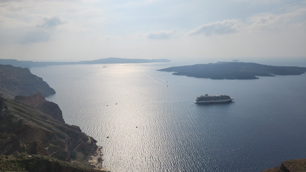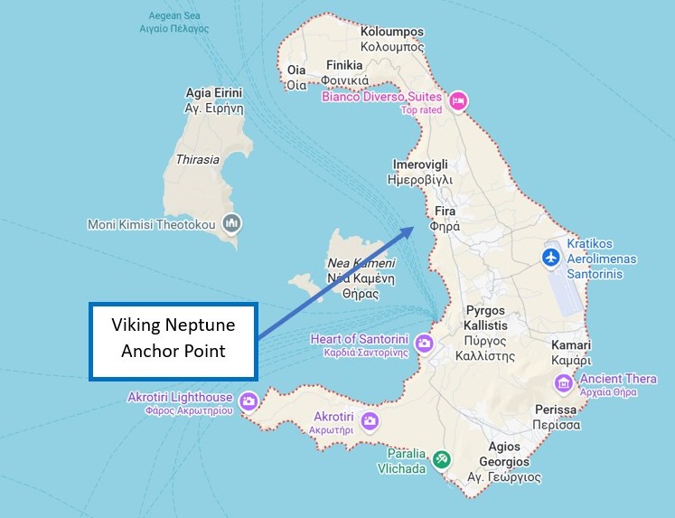 Santorini, Greece (Friday, November 7, 2025): On Friday morning around 9 AM, the Neptune dropped anchor in the waters off the island of Santorini, or Thi̕ra in Greek. Santorini in its present form was created by an enormous volcanic eruption circa 1600 BCE. The eruption destroyed the Minoan settlement at Akrotiri, as well as communities and agricultural areas on nearby islands and the coast of Crete with subsequent earthquakes and tsunamis. What remained behind is a partial caldera, the hollow that remains after a volcano disgorges its contents. Here’s a map of the island showing its configuration and the Neptune’s anchor point.
