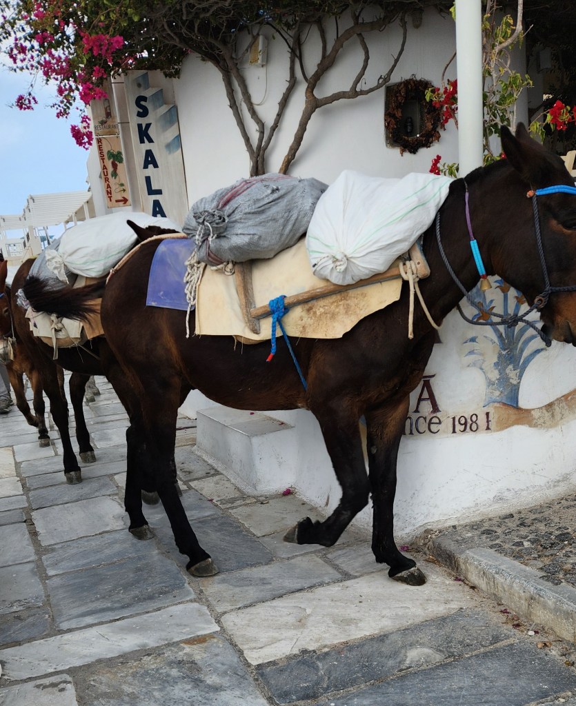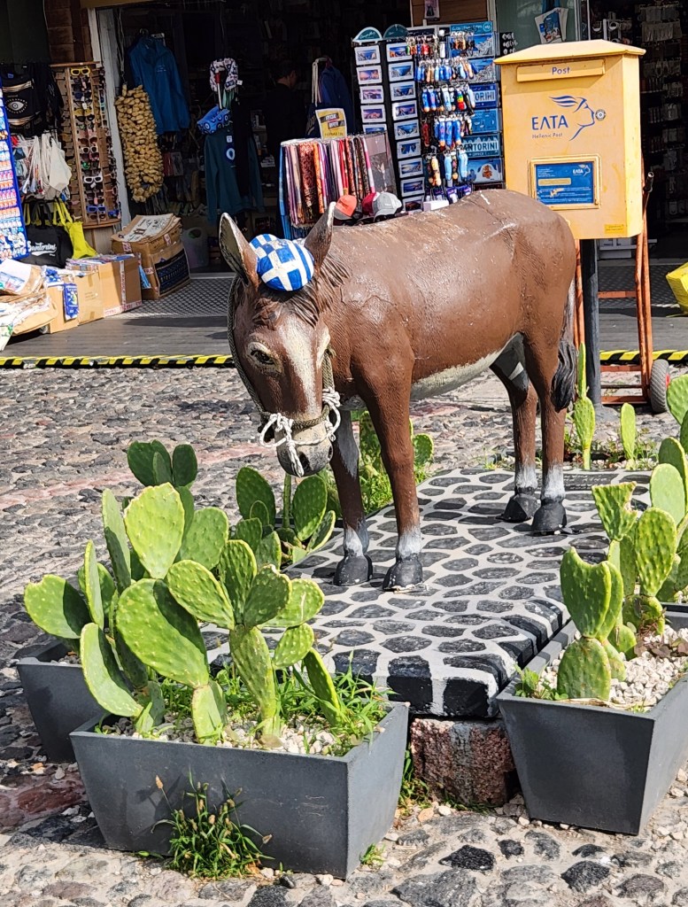 As in many Greek towns, cats are to be seen all over the place. Donkeys are also still used to transport goods from the harbor below, and we were lucky enough to encounter some during our stroll along the main pedestrian street.