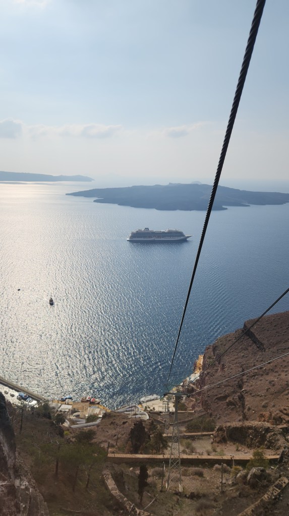 Once it was time to return to the ship, we took a very steep cable car ride down to the harbor below Oia. Two other tourists who rode in the same cable car with us seemed scared nearly witless, but to me it was a suitable thrill to cap off a thrilling day.