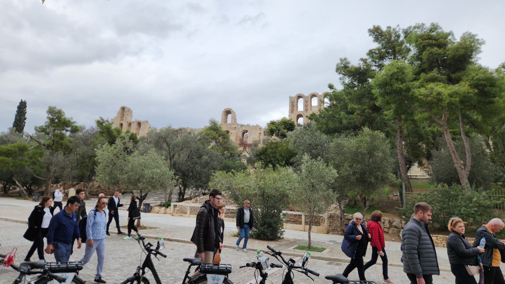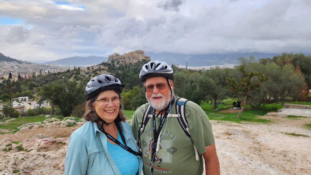 After returning to the ship, we set off again by bus back into Athens for a very enjoyable tour of the city on E-bikes, along with some 18 fellow Viking passengers (all senior citizens like us). For the most part, our ride followed spacious pedestrian boulevards, though we did need to intermingle with cars in a few areas. While a couple of the wobblier riders had spills and suffered minor scrapes along the way, nobody was seriously injured. The main difficulty was starting to ride again after our various stopping points because we had to ride so slowly, often dodging among hordes of pedestrians and motorbikes. Pat and I were unscathed, although her bike died about halfway through. Luckily, our guide, a fit young man some thirty or forty years younger, traded bikes with her and pedaled manually up some of the steepest hills. Here are some photos of the spectacular scenery we encountered during the ride.