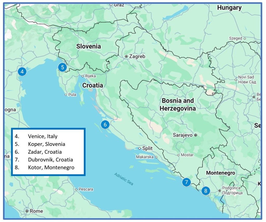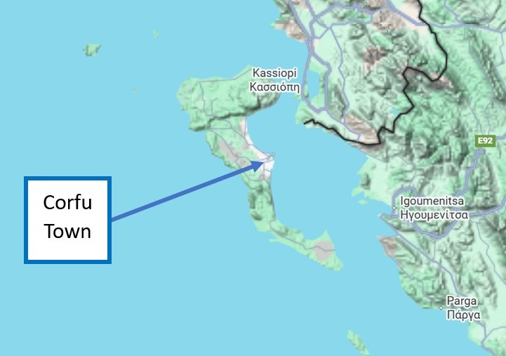 Corfu, Greece (Wednesday, November 5, 2025): After sailing overnight from Kotor, we docked in the Corfu Cruise Port Terminal on the island of Corfu (known as Kérkira in the Greek Language) at about 8 AM on Wednesday. Here’s a map showing the Island and our docking port: