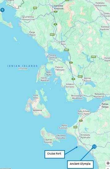 Olympia, Greece (Thursday, November 6, 2025): On Thursday morning the ship docked at the port in Kotakolon, on the northwestern edge of the Peloponnese Peninsula. Kotakolon serves as the main port for access to the ancient site of Olympia. Here’s a map showing Corfu, Kotakolon, and the ancient site: