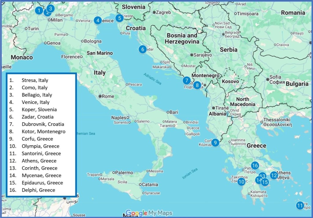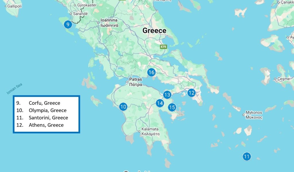Welcome back for Part 3 of this travelogue series. Part 2 concluded as we sailed away from Kotor, Montenegro, down the Adriatic Sea toward Greece. Here’s a map showing the places I’ll describe in this part of the travelogue: Corfu, Olympia, Santorini, and Athens, all in Greece.